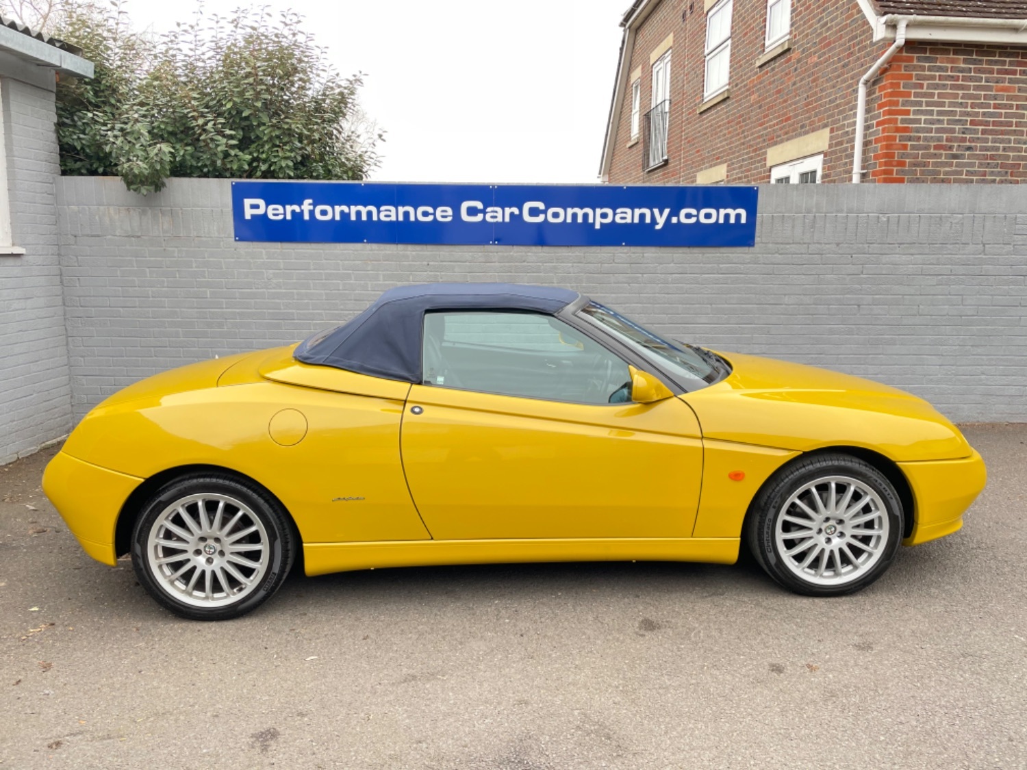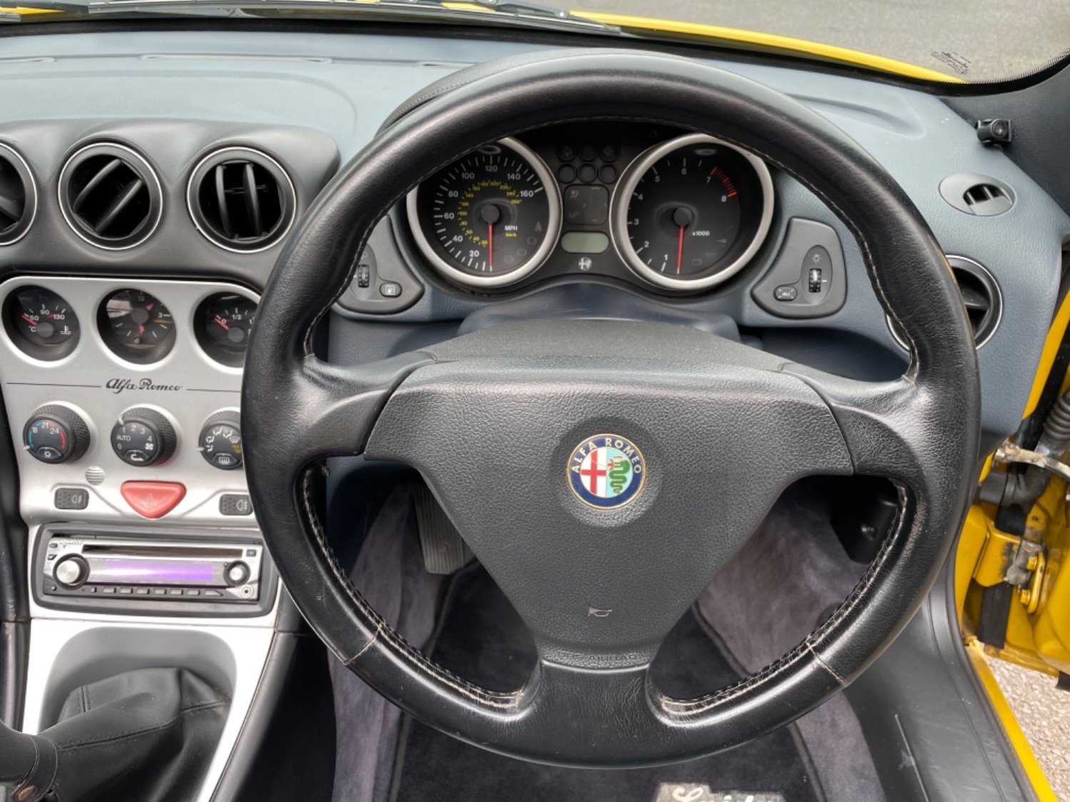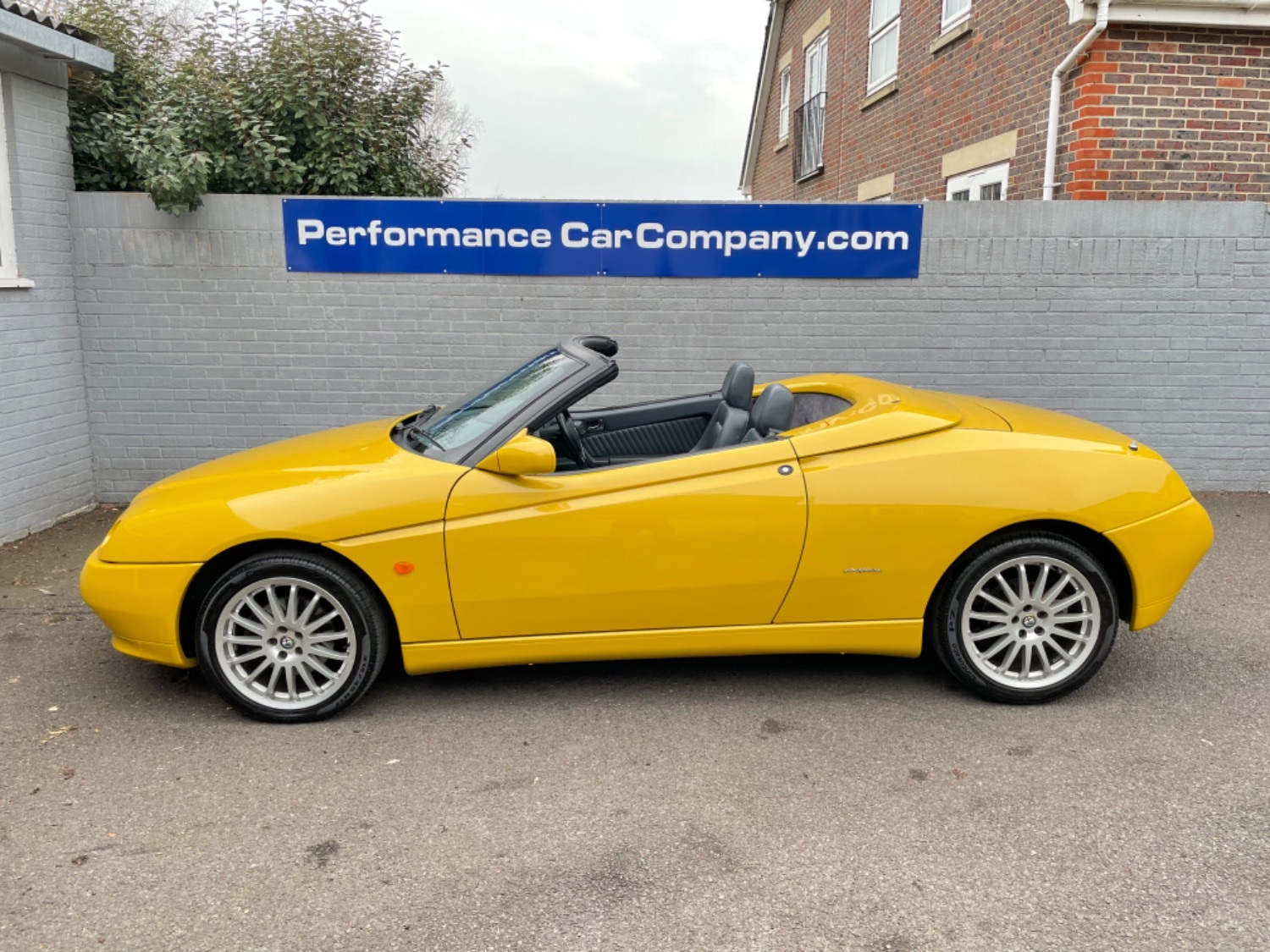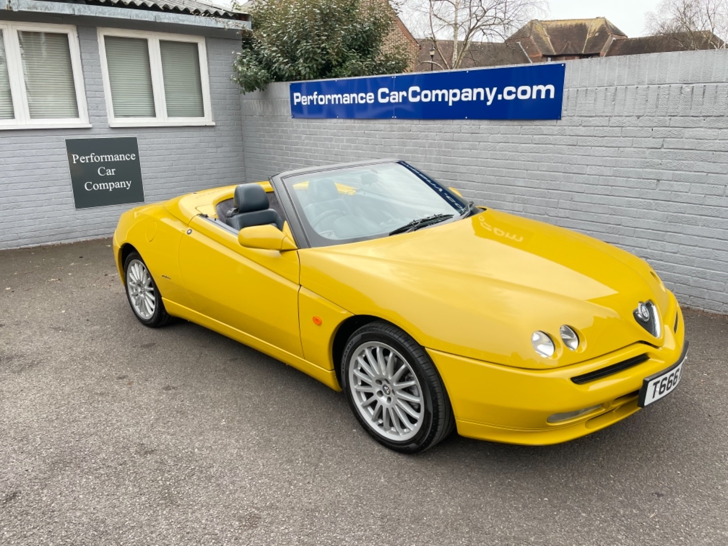 1999 T Alfa Romeo 2.0 Twinspark 16V Spider Finished in Rare Metallic Zoe Yellow and in absolutely Fabulous Condition, Complemented with Navy Blue Leather Seats and Navy Manual Hood, Electric Windows, Remote Alarm And and Central Locking, 17 Alloys with Pirelli P7 Tyres all round, this car was part exchanged into us by previous owner who had purchased the car from an Alfa Specialist and Restorer as they were retiring. The bodywork is presented in absolutely Fantastic condition and we couldn’t believe how good it looked in the flesh, both inside and out. This Alfa Romeo Spider drives superbly and is a pleasure to be in. We have a history folder with lots of bills over the life of this car including at 75000 miles in 2006 the engine was stripped down and pistons and rings were replaced along with water pump by Alfa Romeo Specialist. There was a problem with the mileage display where it became unreadable and this was not rectified for a few years until a secondhand unit was installed when the car had done approximately 90,000 miles, the new unit read 73000 miles and now reads 87,000 miles so we estimate that the car has covered approximately 104000 miles in total, not that you would believe it if your saw it as it looks fabulous and is a pleasure to Drive. Due to the Speedo issue we are unable to warrant the mileage but this Alfa makes a superb Useable Classic car which is still a head Turner and all for less than Five Thousand Pounds. UK Supplied with History Folder including engine Rebuild, Handbook and Spare Key.