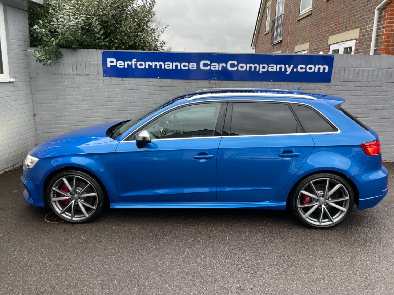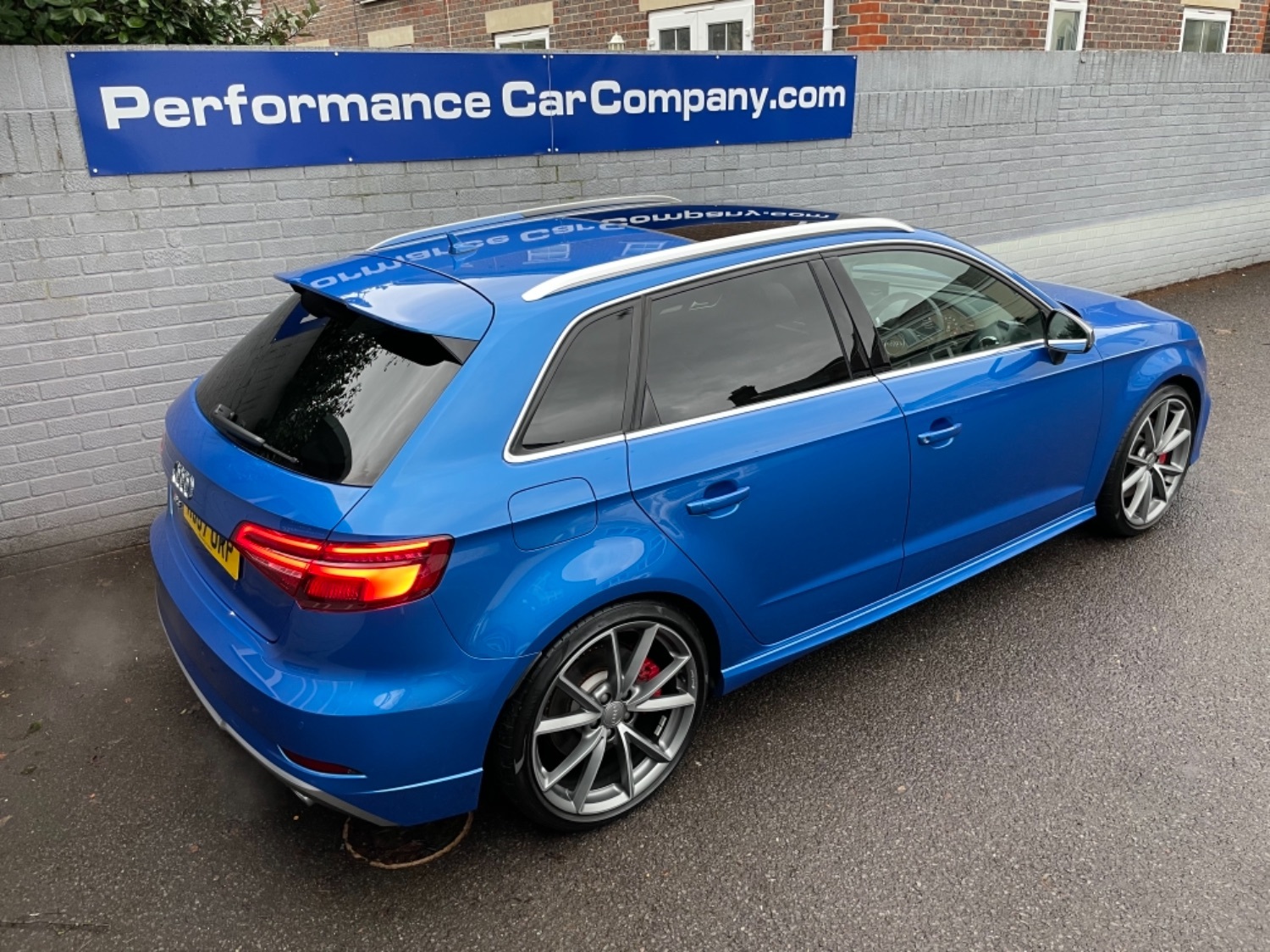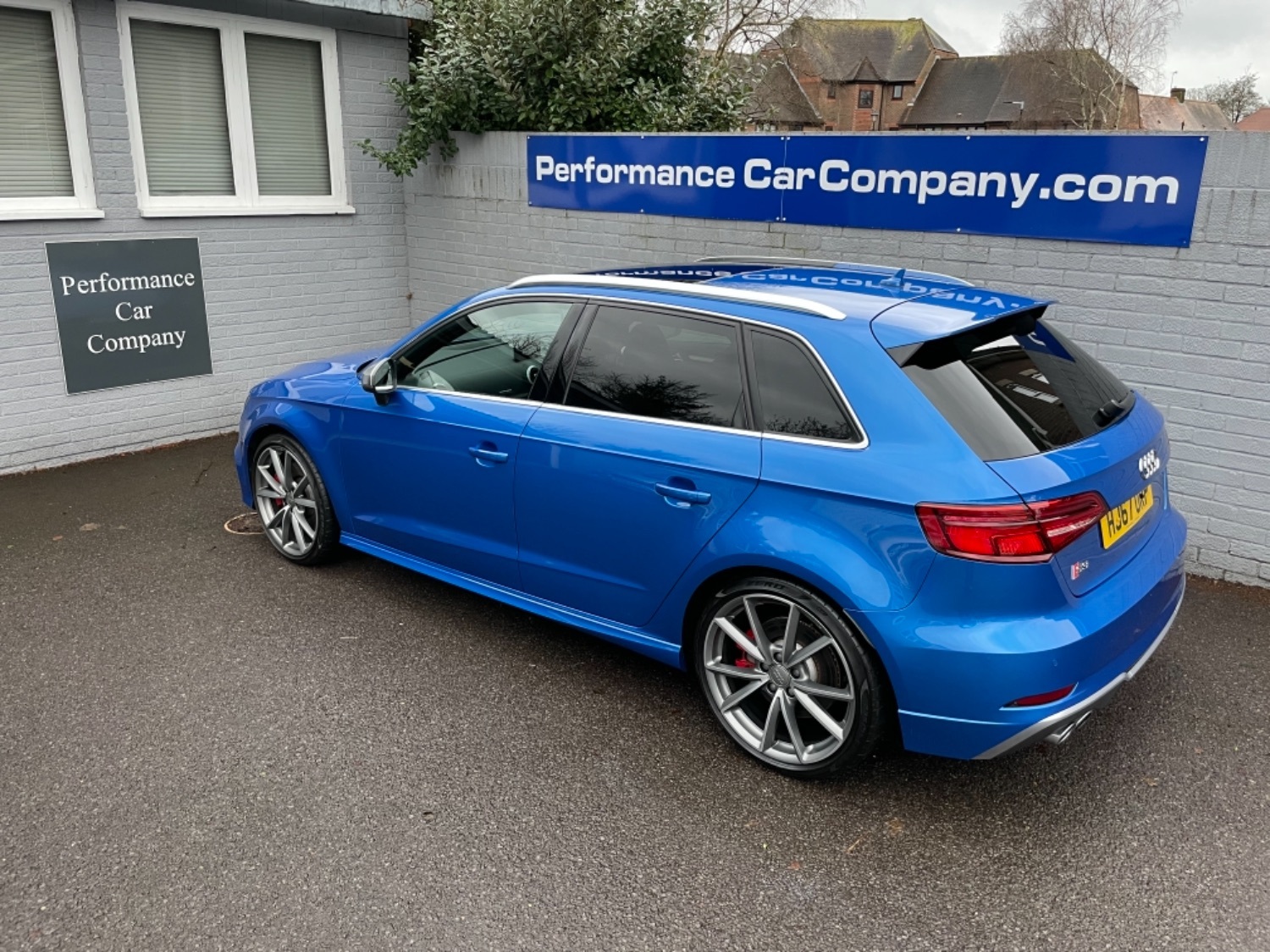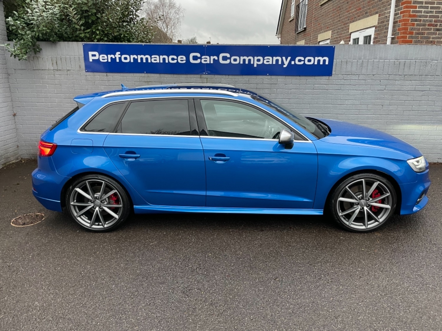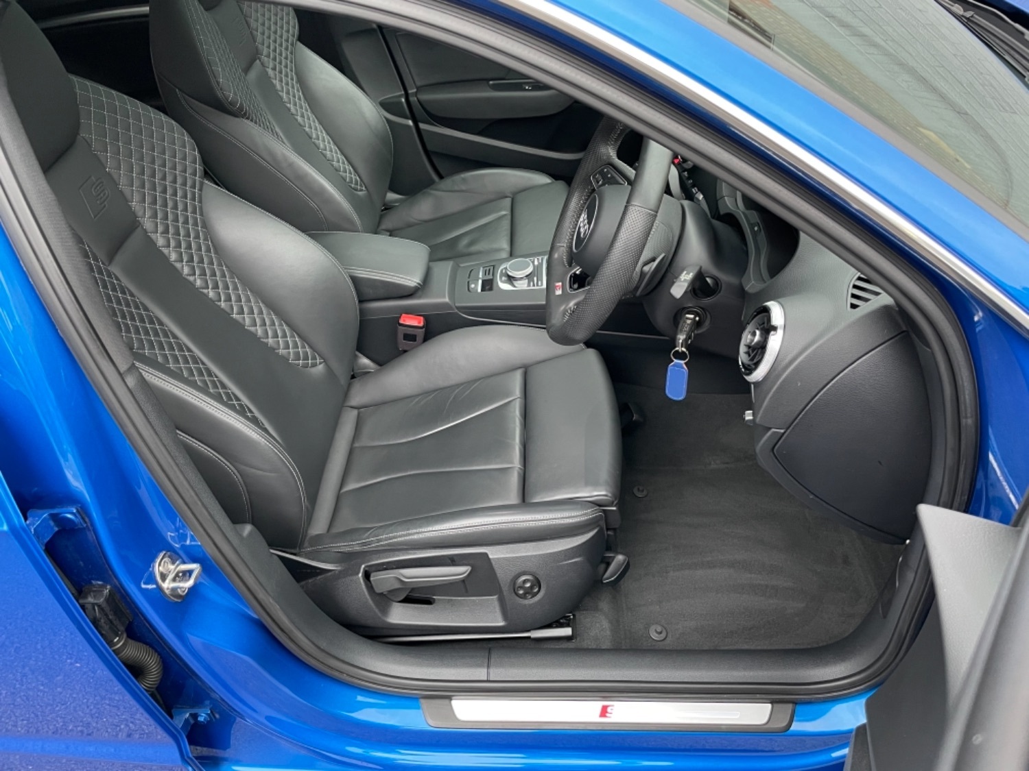 2017/67 Finished in Ara Blue Crystal Effect with Only 12,000 miles with Full Audi Main Dealer service history with Services Entries at 7526 miles, 10737 miles and 12098 miles in September 2020 including Haldex Oil Change. Purchased From Audi by Current Owner at 1700 miles in April 2018. Black SuperSports Wing Back Leather Seats with Quilted Leather with White Stitching and Electric Lumbar Support, Heated Seats, Digital Cockpit, Flat Bottom Sports Multi Function Steering Wheel, Cruise Control, Electric Panoramic Roof, MMi Satellite Navigation Plus, 19 Unmarked 5 V Spoke Titanium Alloys with Pirelli Pzero Tyres All Round, Electric Folding Mirrors, Rear Privacy Glass, Climate Air Conditioning, Electric Windows, Remote Alarm and Central Locking, Rear Parking Sensors, Xenon Headlights, Auto Lights, Factory Bluetooth, Audi Drive Select, Audi Puddle Lights. Absolutely Fantastic Original Condition and Great Opportunity to Buy a Very Low mileage S3 Sportback with Superb Specification and in Stunning Colour Combination. UK Supplied with Full Book pack, Spare Key and Ready to go.