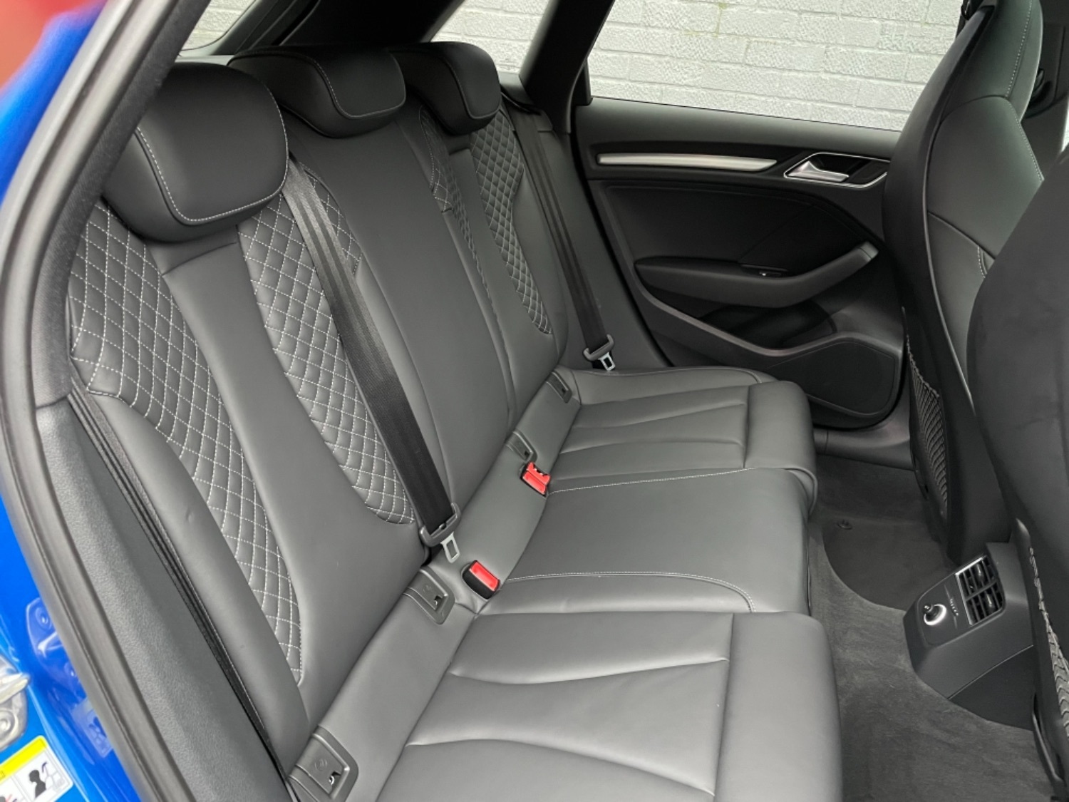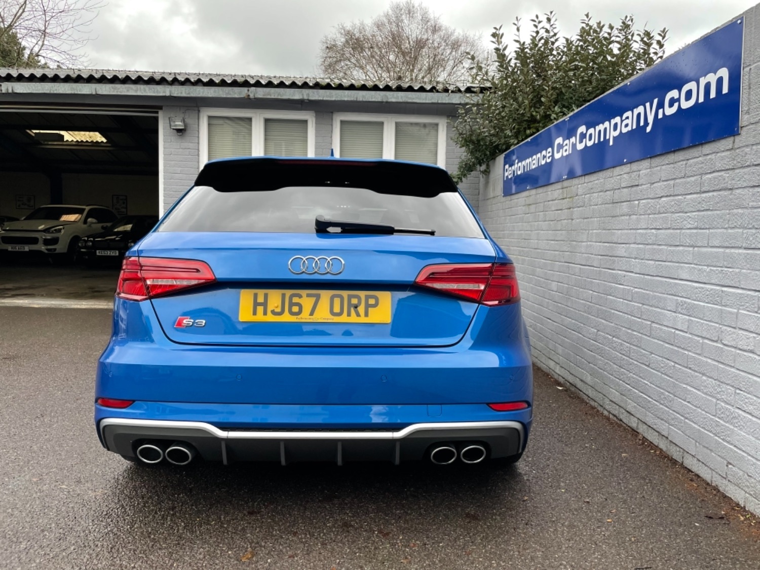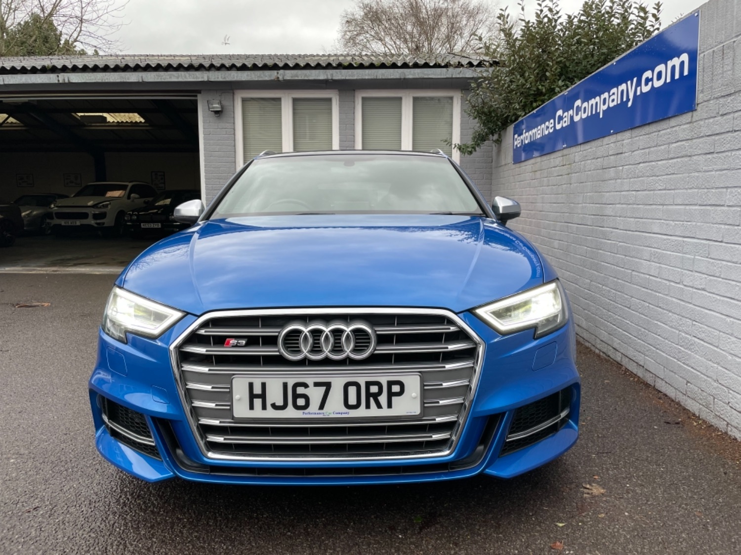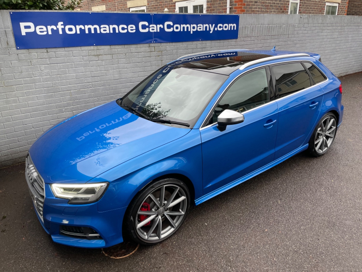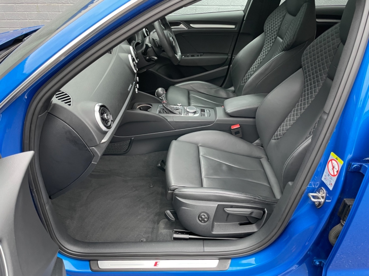 2017/67 Finished in Ara Blue Crystal Effect with Only 12,000 miles with Full Audi Main Dealer service history with Services Entries at 7526 miles, 10737 miles and 12098 miles in September 2020 including Haldex Oil Change. Purchased From Audi by Current Owner at 1700 miles in April 2018. Black SuperSports Wing Back Leather Seats with Quilted Leather with White Stitching and Electric Lumbar Support, Heated Seats, Digital Cockpit, Flat Bottom Sports Multi Function Steering Wheel, Cruise Control, Electric Panoramic Roof, MMi Satellite Navigation Plus, 19 Unmarked 5 V Spoke Titanium Alloys with Pirelli Pzero Tyres All Round, Electric Folding Mirrors, Rear Privacy Glass, Climate Air Conditioning, Electric Windows, Remote Alarm and Central Locking, Rear Parking Sensors, Xenon Headlights, Auto Lights, Factory Bluetooth, Audi Drive Select, Audi Puddle Lights. Absolutely Fantastic Original Condition and Great Opportunity to Buy a Very Low mileage S3 Sportback with Superb Specification and in Stunning Colour Combination. UK Supplied with Full Book pack, Spare Key and Ready to go.