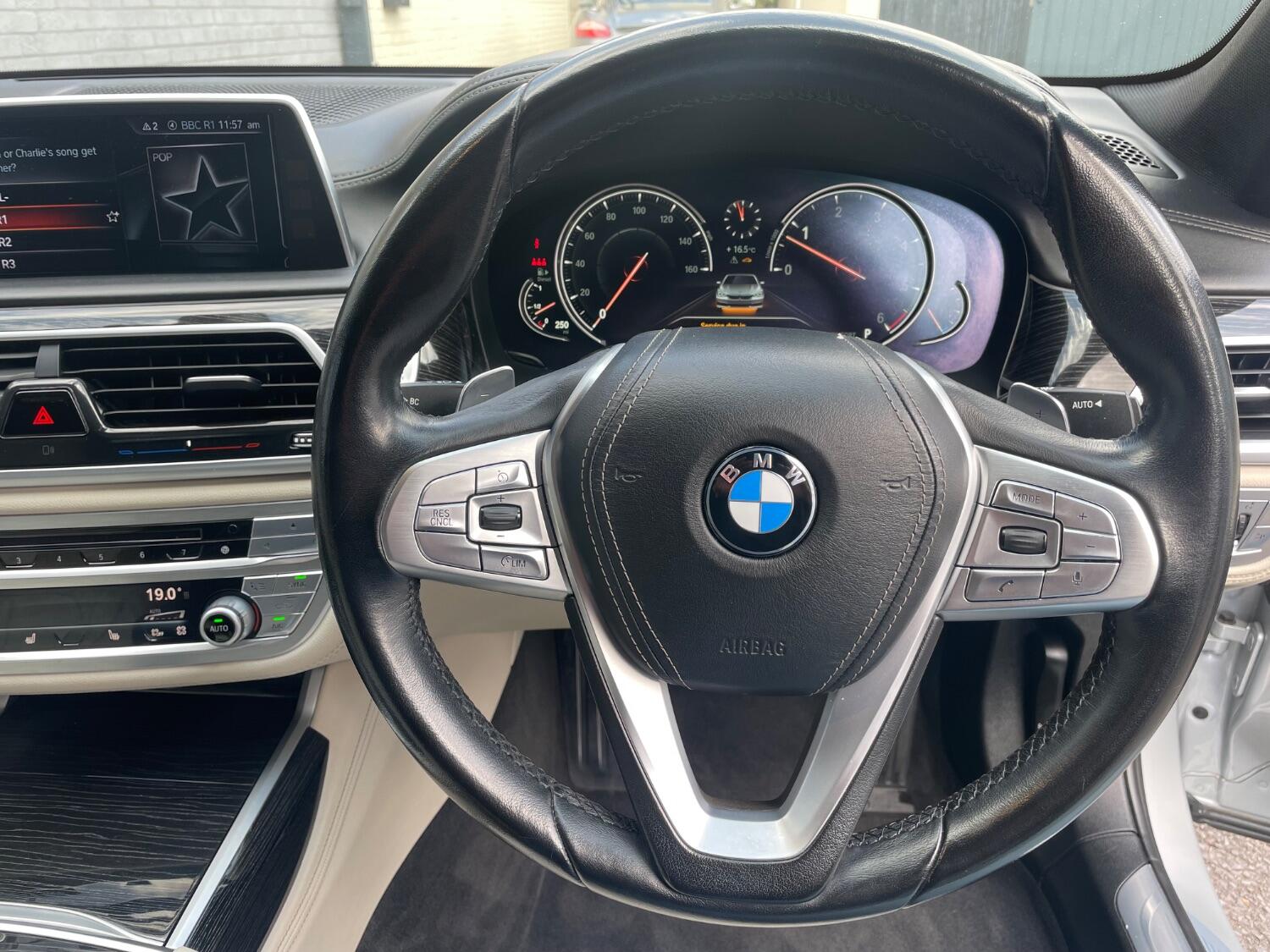 2016 /66 BMW 730d Sport XDrive Finished in Metallic Glacier Silver with 69,000 miles and a Full BMW Main Dealer Service History, Full Exclusive Ivory Nappa Leather, Electric Front and Rear Seats plus Memory Seats all round, Electric Steering Column, Heated Seats front and rear, Massaging Front Seats, 19”Alloys with Pirelli PZero Tyres All Round, BMW Icon Adaptive LED Headlights, Auto Lights, Satellite Navigation, HUD Heads Up Display, BMW Bluetooth, Multi Function Steering Wheel, Cruise Control, Keyless Entry, Push Button Start, Illuminated M Door sills, Front and Rear Parking Sensors, Soft Close Doors, Electric Boot, Rear Sun Protection Glass, Reversing Camera, Climate Air Conditioning, Electric Steering Column, Electric Windows, Electric Folding Mirrors. Absolutely Beautiful 7 Series in Lovely Colour combination and in Fantastic Condition. Private Number plate included in Sale. UK Supplied with Full Book Pack, Spare Key.