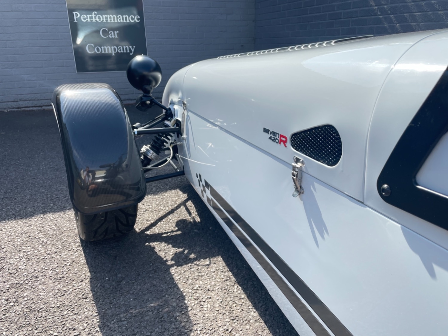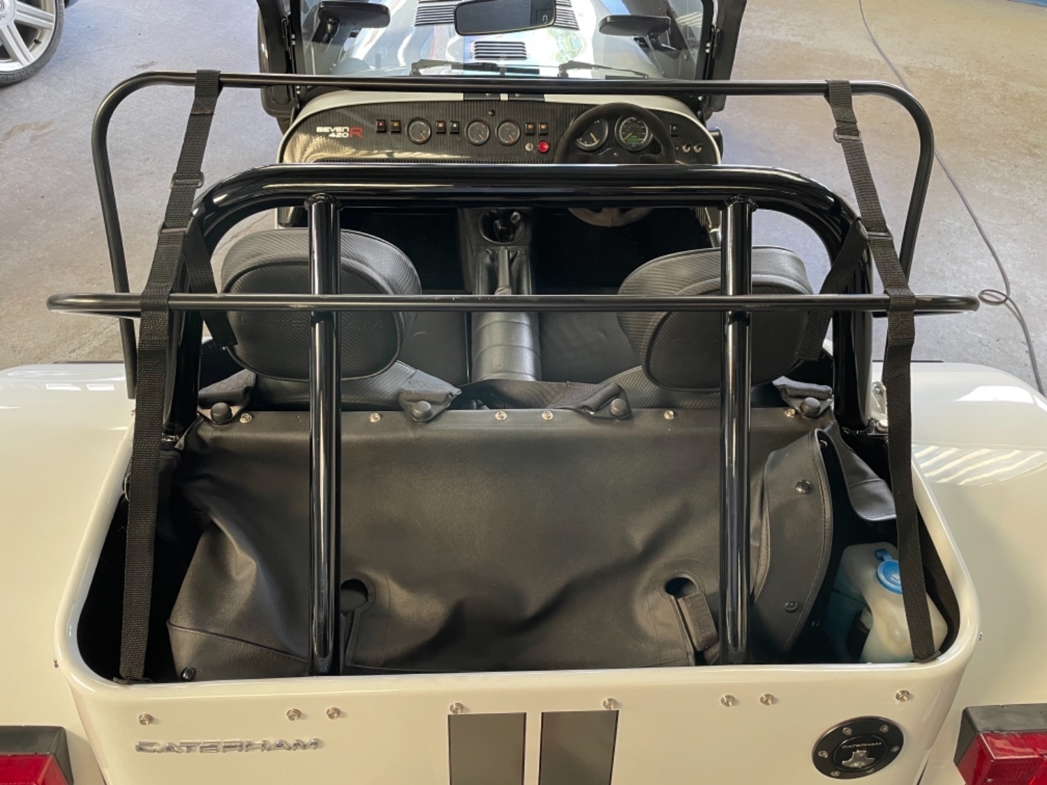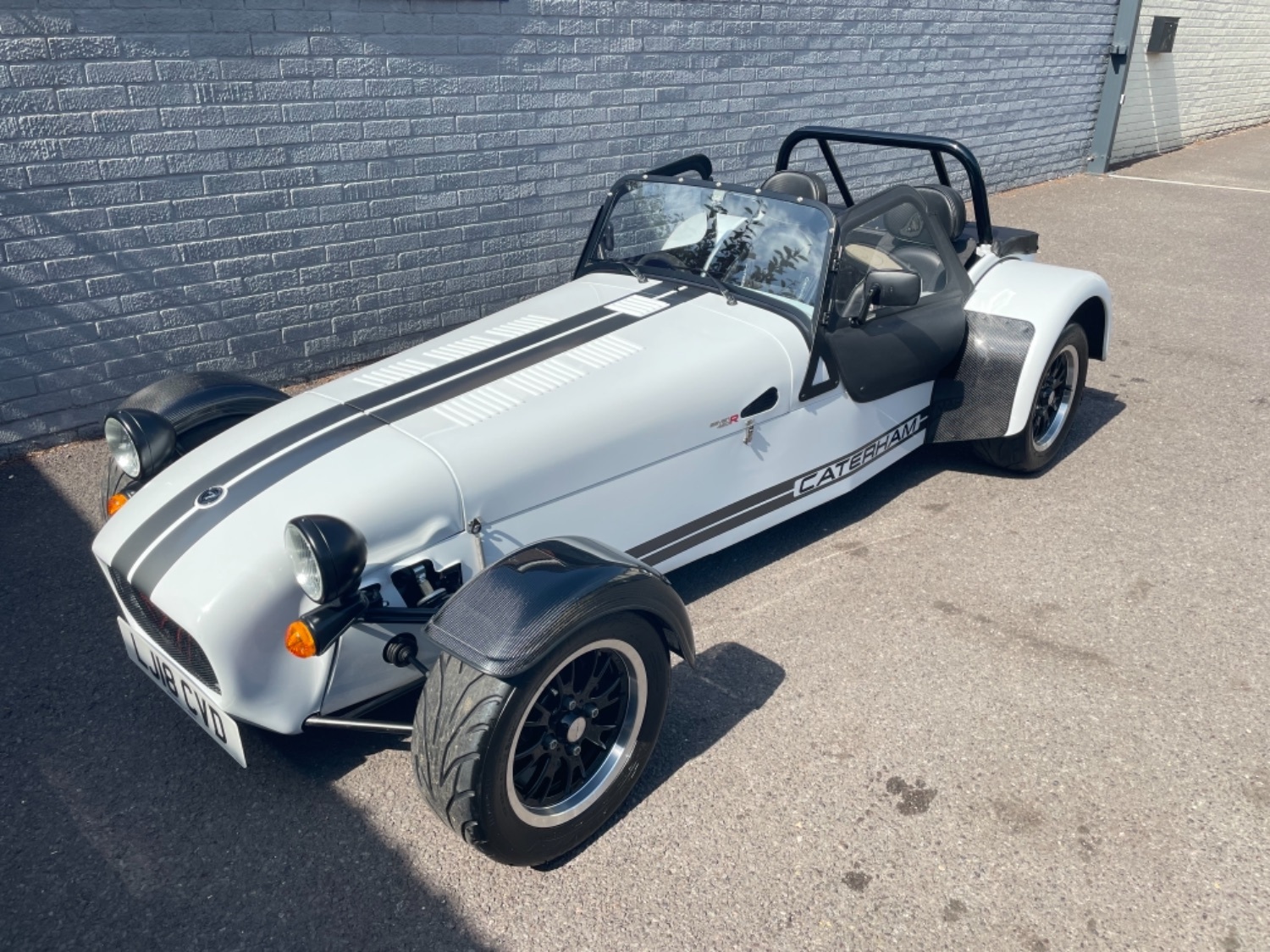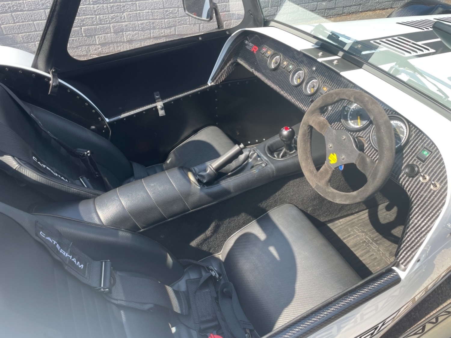 The car was freshly painted in Polar White with titanium double stripes applied. Around the car you’ll find it’s been specified up to a very high level and includes 13″ Apollo Black alloy wheels with Polished edges wrapped in Avon ZZS tyres, Sports Suspension, Painted Red Seven Grill, uprated brakes with quad piston front calipers, carbon leather seats, heater and heated windscreen with full weather equipment, Suede Momo Quick Release Steering Wheel, Carbon Wheel Covers and plenty more. If you’re looking for a car to enjoy a nice day on the road or to attack the track this car has been specified to excel in both areas.