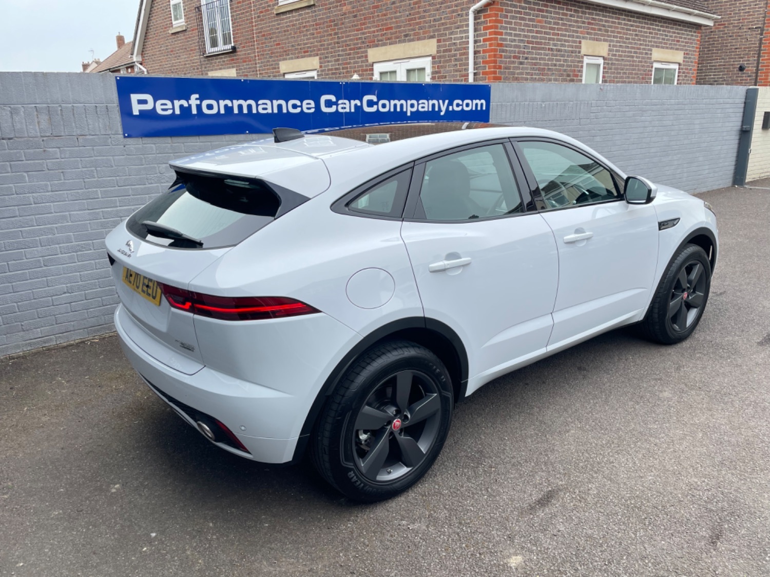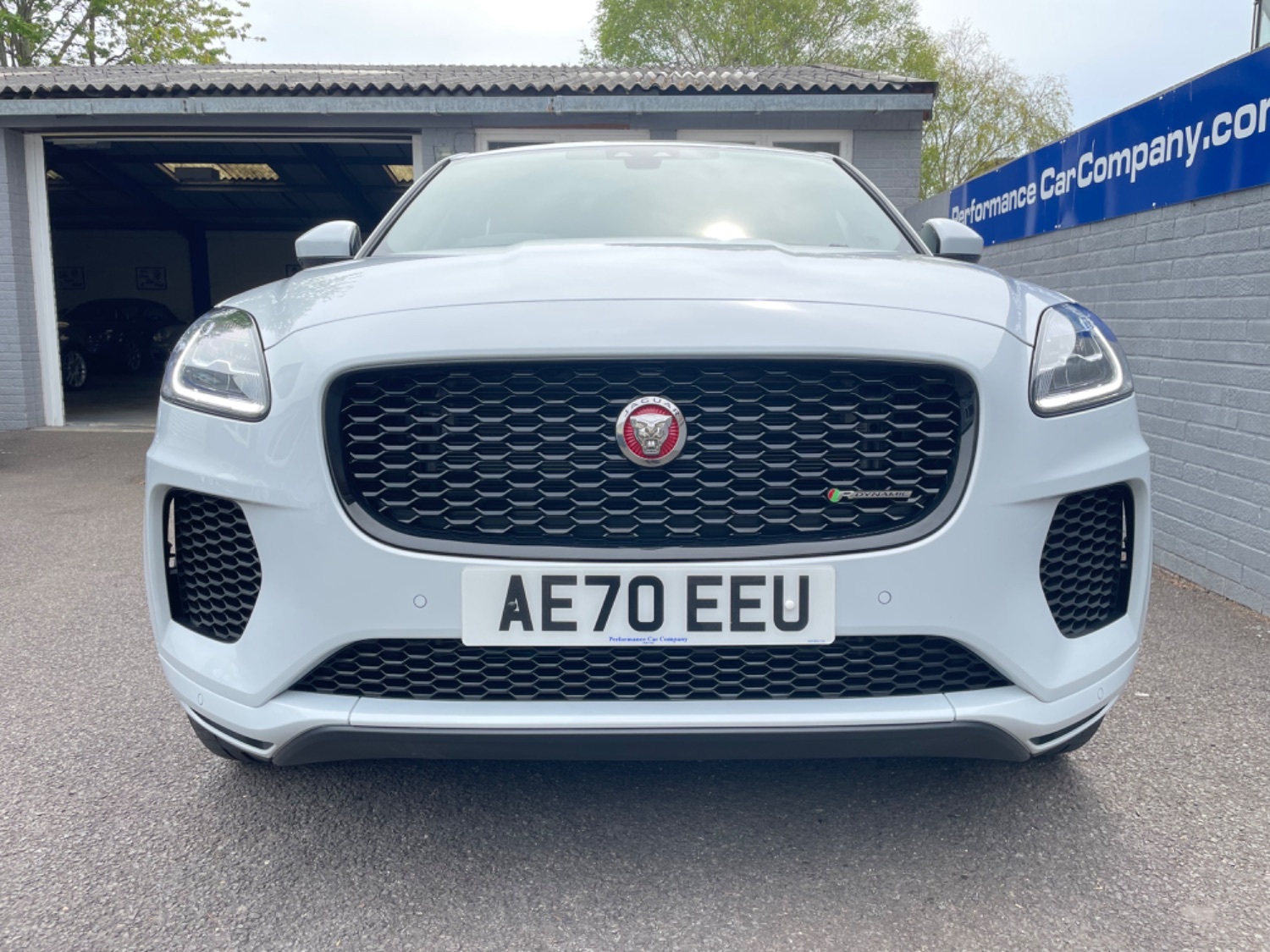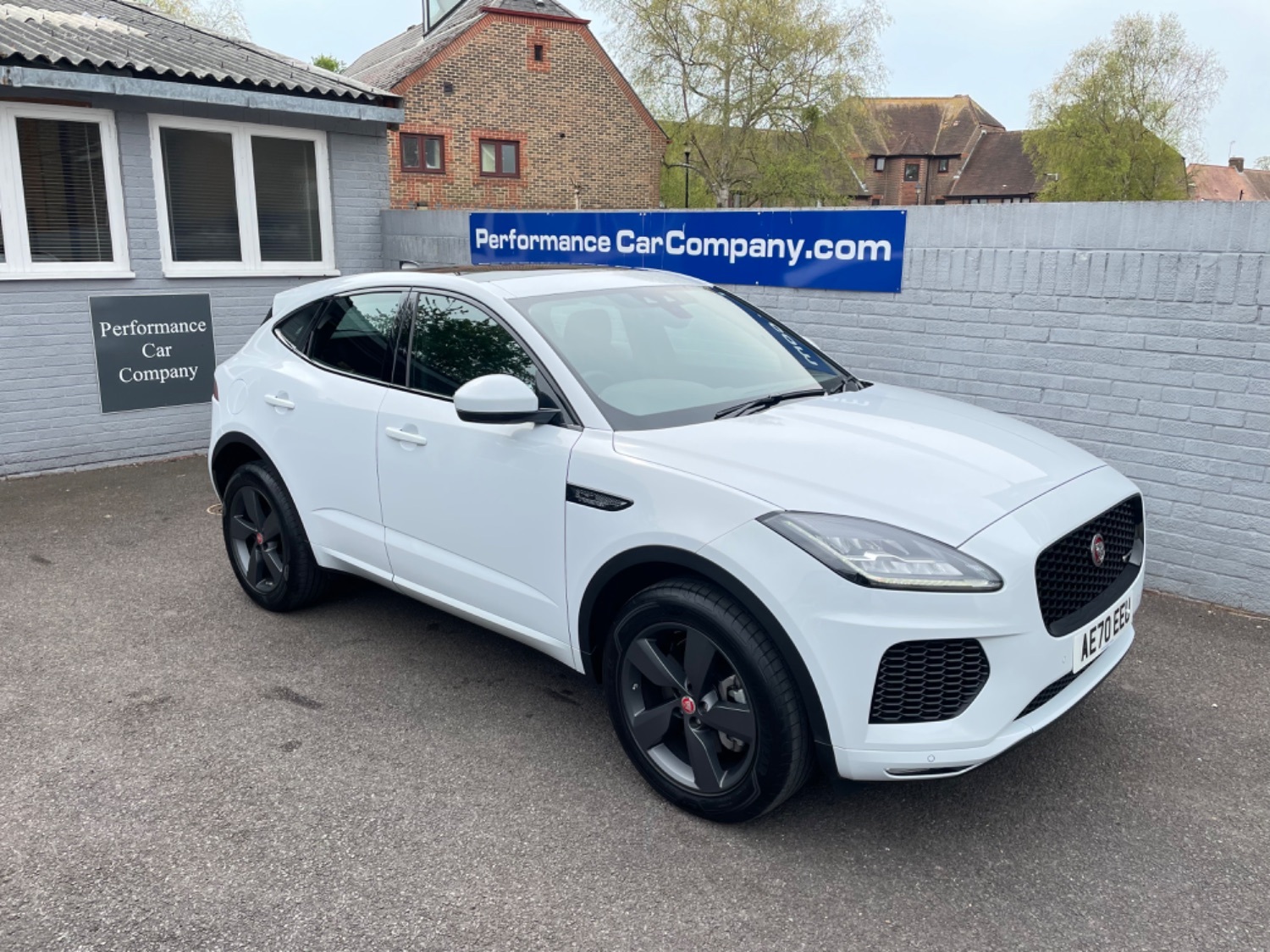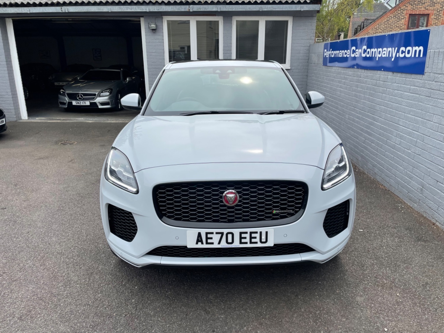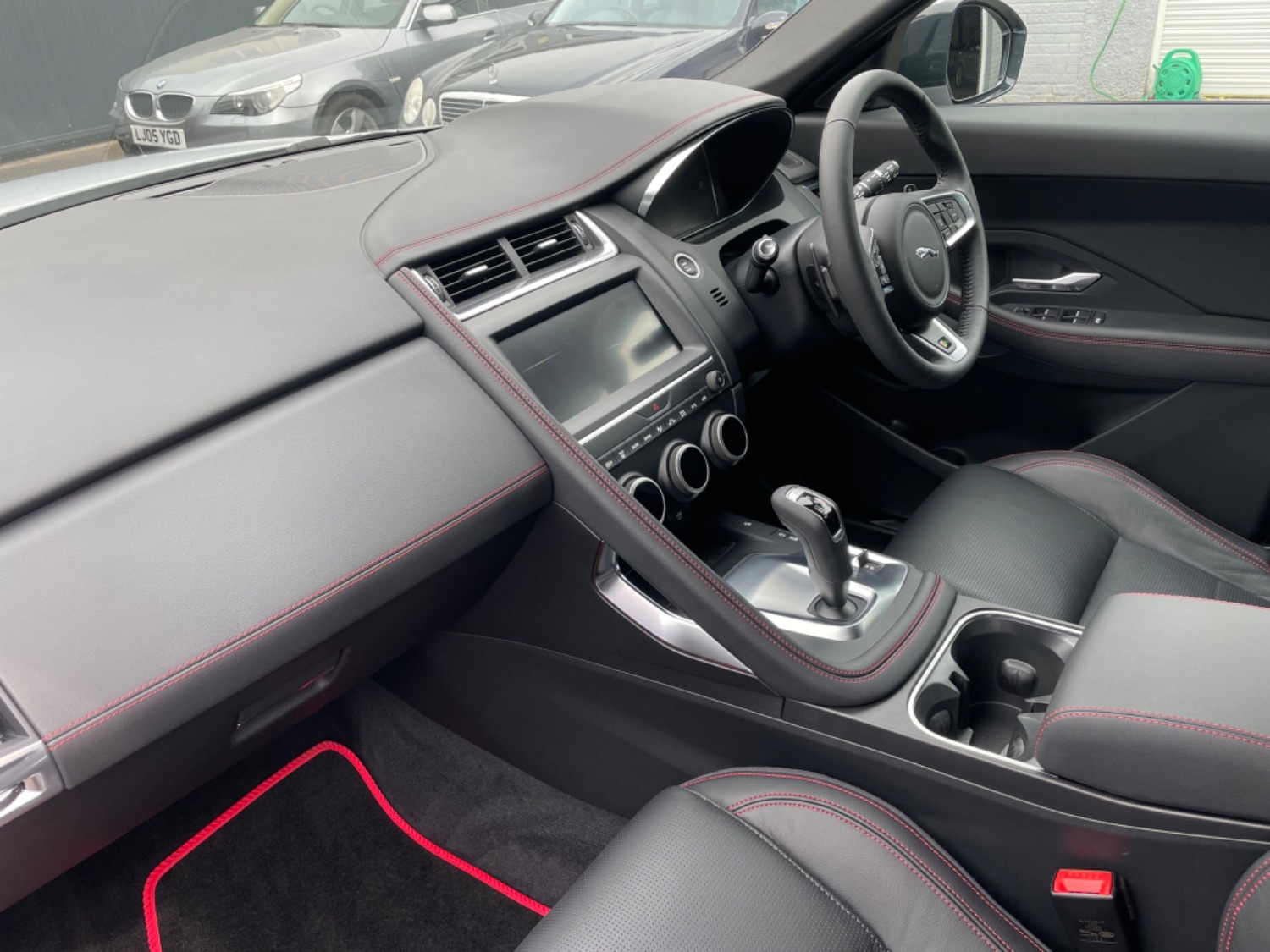 2020 / 70 Jaguar E-Pace R-Dynamic Chequered Flag P200 AWD Finished in Yulong White with only 1600 miles from New, Black Ebony Leather with Red Stitching, 10 Way Electric Seats, Panoramic Roof, Reversing Camera, R-Dynamic branded Leather Multi Function Steering Wheel with Satin Gearshift paddles, Cruise Control, 19 5 Spoke Unmarked Satin Grey Alloys, LED Headlights with Signature DRL, 10 inch Satellite Navigation Pro with Apple Car Play Bluetooth, Power Tailgate, Keyless Entry and Push Button Start, Front and Rear Parking Sensors, Park Assist, Lane Keep Assist, Electric Folding Mirrors, Autolights, Heated Front Screen, Black Exterior Pack. Williams Racing Ceramic Paint and Interior Protector. This E Pace has covered only 1600 miles and is like New and available to be driven away today at a Fantastic Price for this low mileage. Manufacturers Warranty Until October 2023.