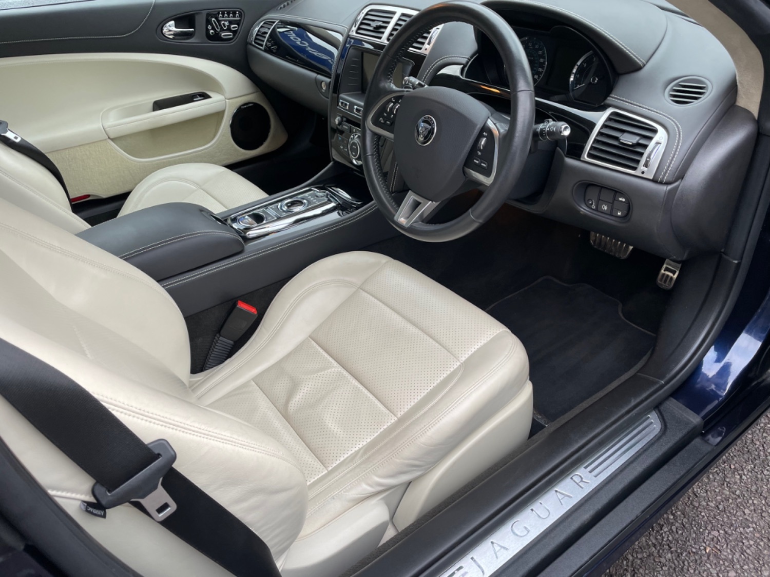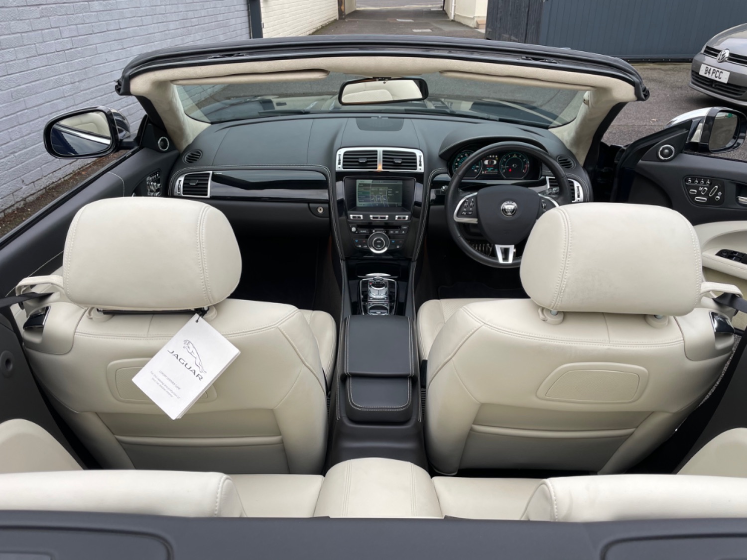 And centre Console with Ivory Stitching, 20 Inch Alloys with Pirelli Pzero Tyres all Round, Satellite Navigation, Factory Bluetooth, Xenons, Auto Light, Bowers & Wilkins Sound System, Multi Function Steering Wheel with Paddle Change, Heated Steering Wheel, Cruise Control, Front and Rear Parking Sensors, Rear Reversing Camera, Chrome Door Mirror Covers, Blue Power hood, Added Option of 18 Inch Spare wheel, Keyless Entry with Push Button Start, Remote Alarm, Electric Windows, Electric Folding Mirrors. Owner purchased private registration of XK14 JAG at a cost of over 3000 pounds as shown in the pictures and this plate is available for an additional 1000 pounds if required. Absolutely Stunning Condition and Looks Fabulous in this Colour Combination. UK supplied with Full Book Pack, Original Bill of Sale and Spare Key.