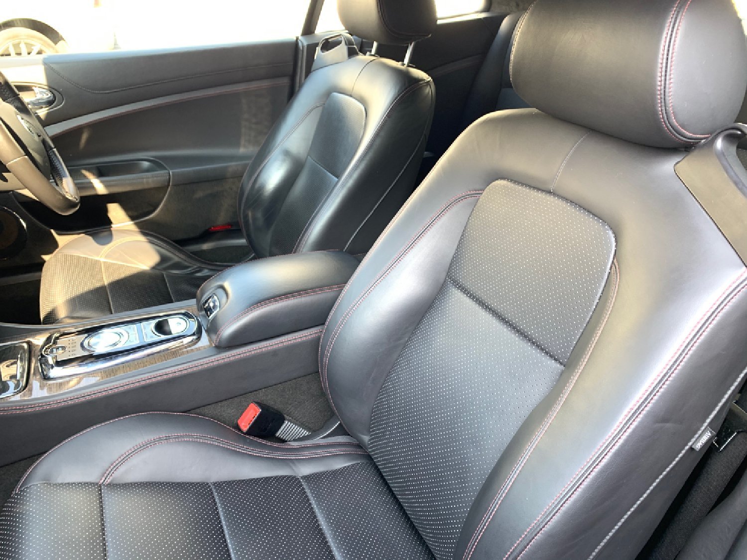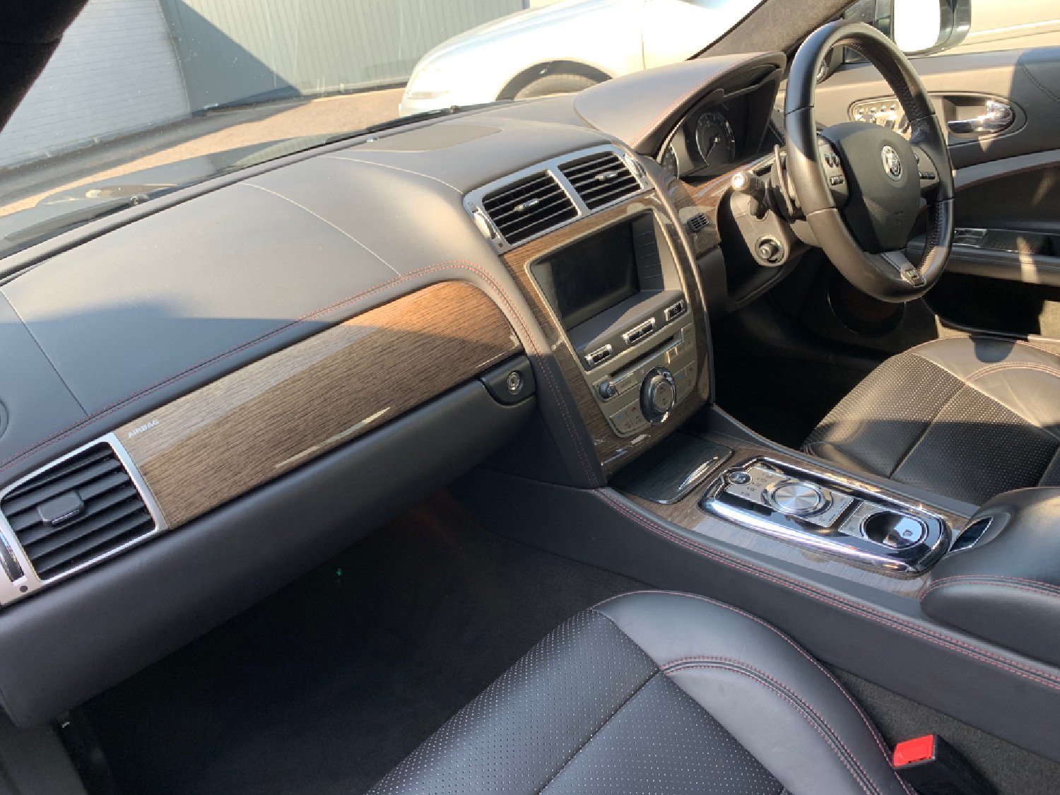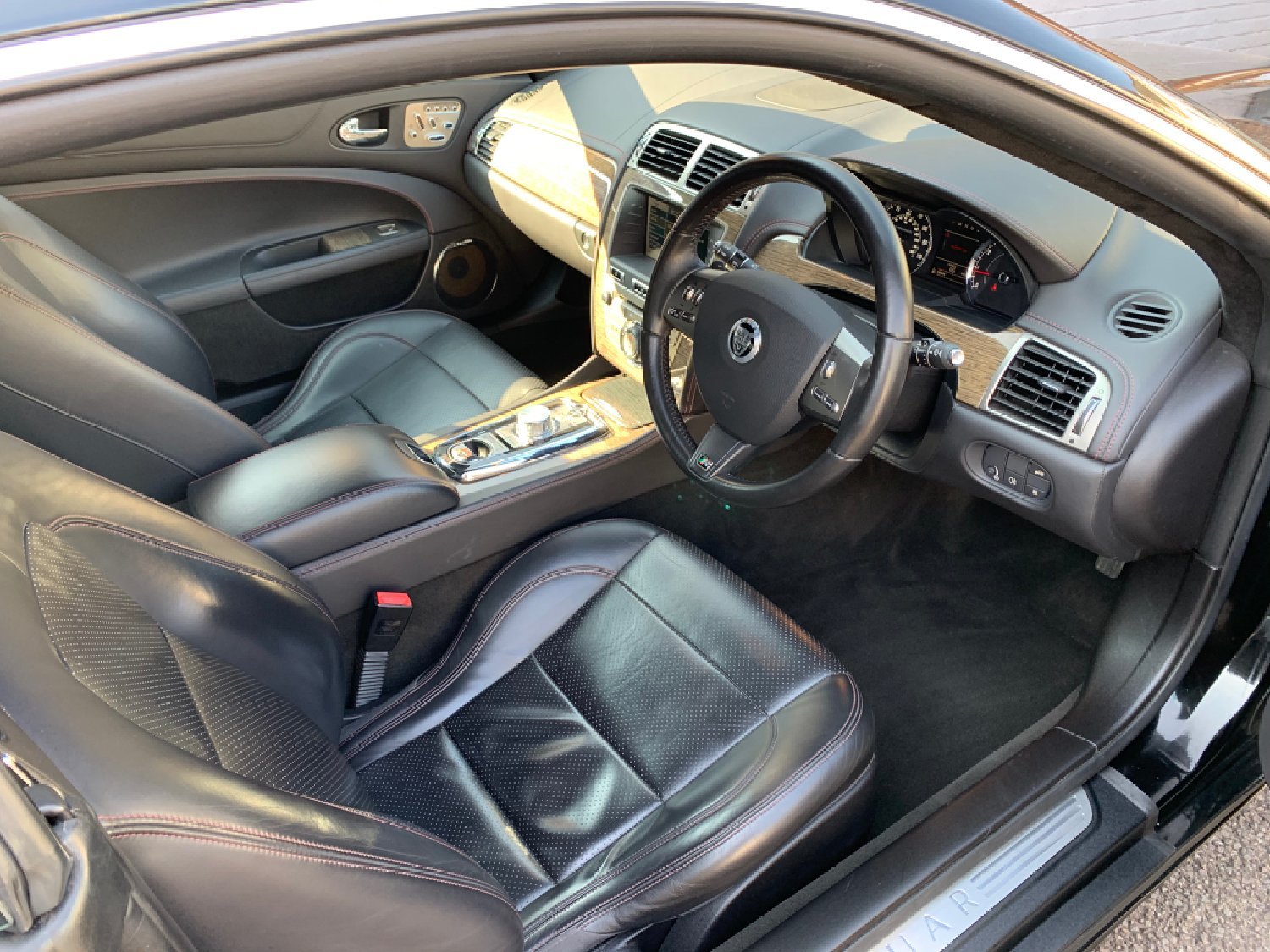 Jaguar XKR 5.0 Supercharged Finished in Metallic Black with Only 59500 miles with Total Jaguar Main Dealer Service History with services at 14478 miles, 23425 miles, 30392 miles, 34811 miles, 39595 miles, 43616 miles, 48021 miles, 51880 miles, 55479 miles and 59310 miles including New Front Discs and Pads, Full Black Electric Memory Leather Seats with Red Stitching, Heated Seats + Cooling Seats, Heated Steering Wheel, Electric Steering Column, Factory Touchscreen Satellite Navigation, Factory Bluetooth, Bowers and Wilkins Speakers, CD, Multi Function steering wheel, Cruise Control, 20 Alloys with Dunlop Sport Tyres all round, Keyless entry and push button start, Electric Folding Mirrors, remote alarm, Electric Windows. Superb Condition and Value for a low mileage 5.0 XKR in great Colour Combination with Total Jaguar Main Dealer Service History.
