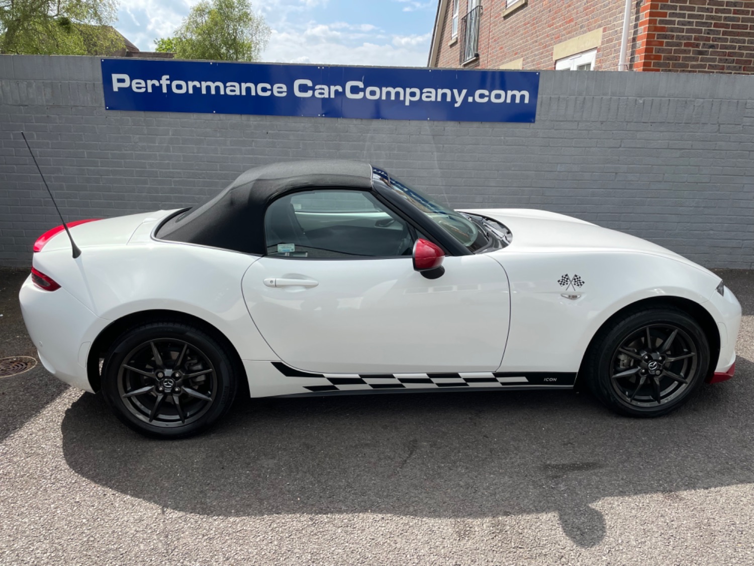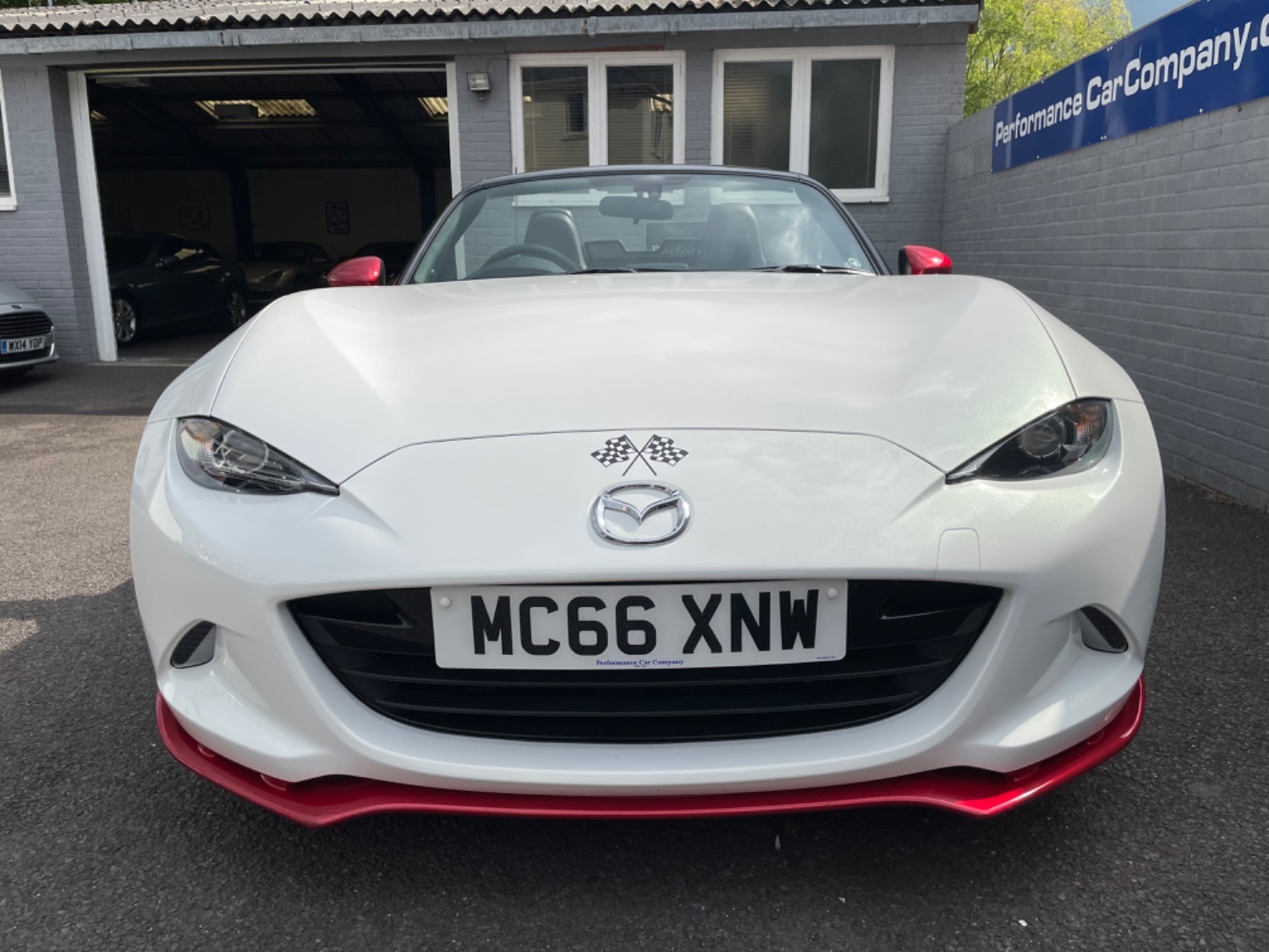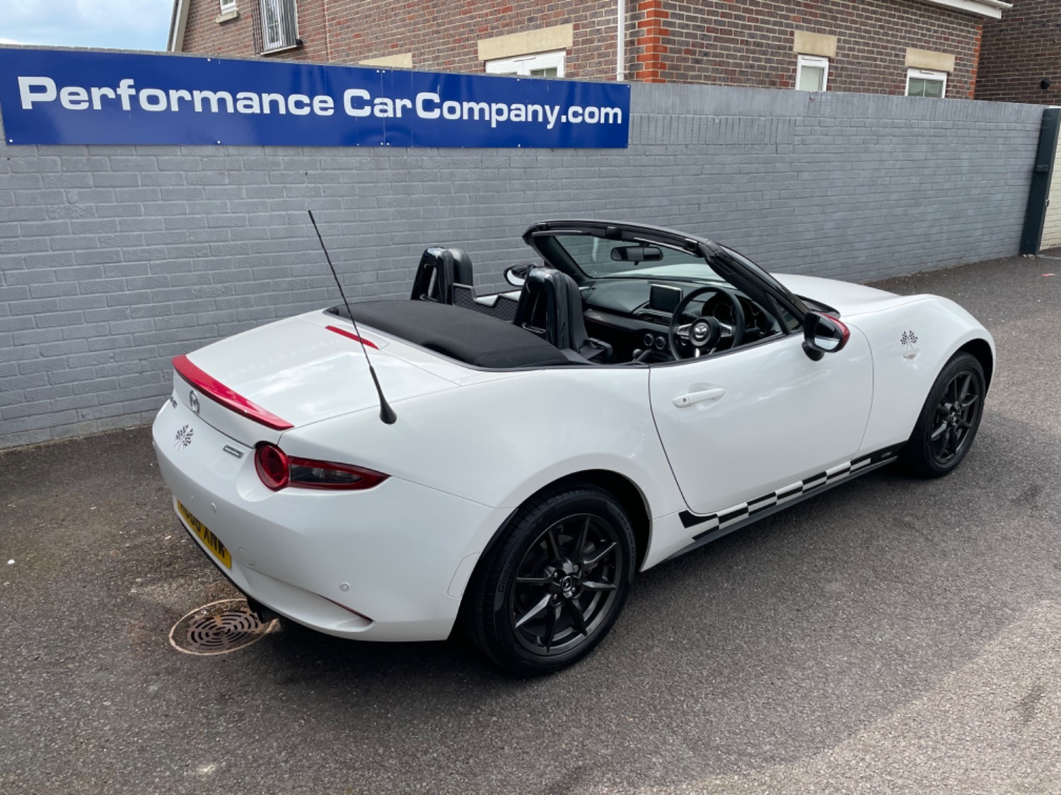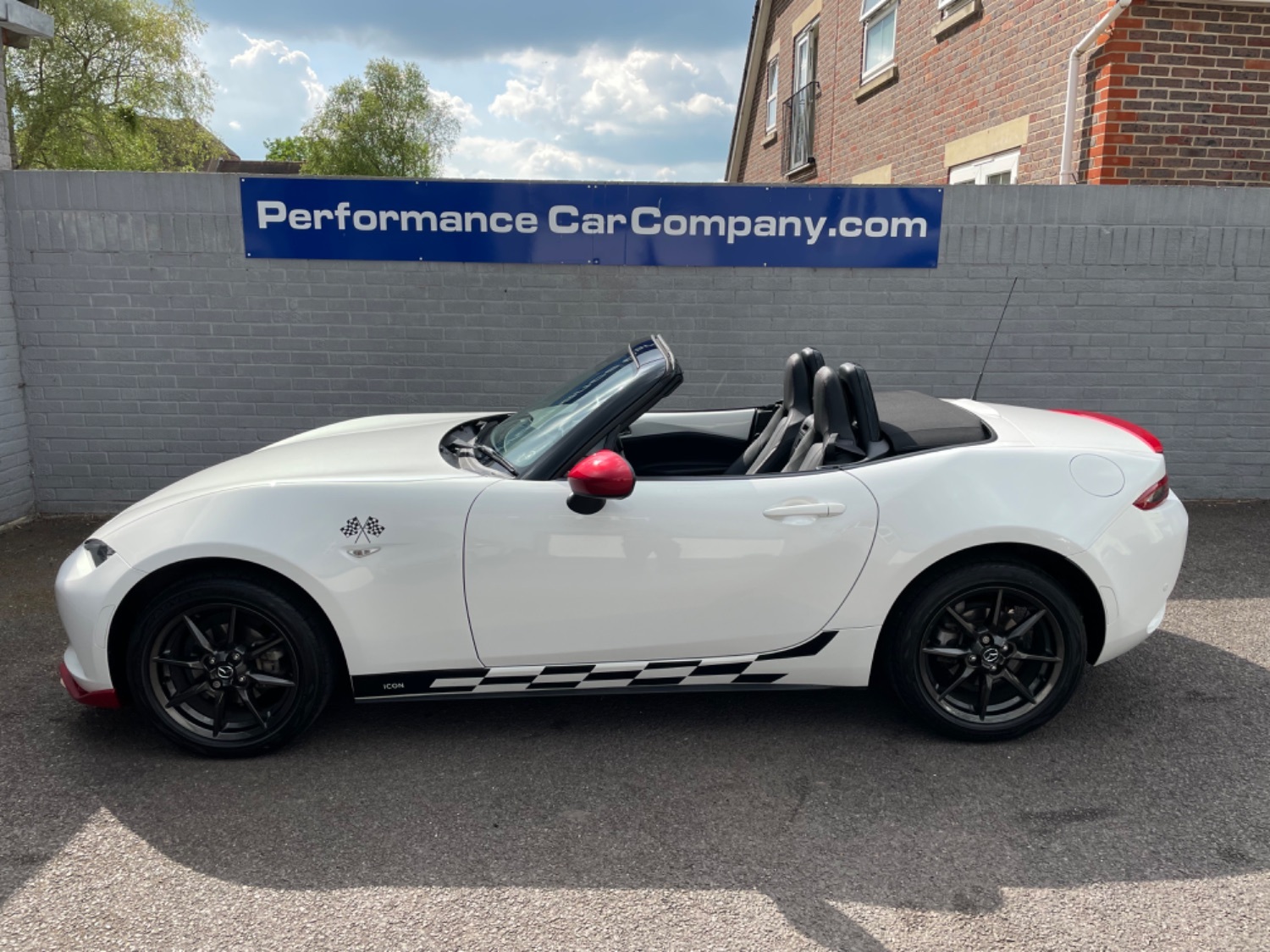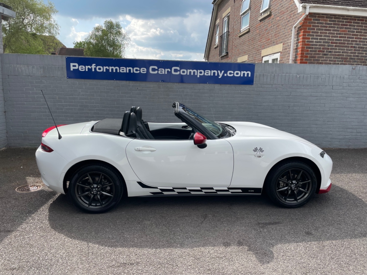 2017 / 66 Mazda MX-5 Icon Limited Edition 1 of 600 made, Finished in Crystal White Pearlescent with door mirrors, front and rear spoiler finished in Soul Red Metallic + Chequered Flag Decals, Having covered Only 19000 miles and with a Full Service History, 6 Speed Manual, Full Black Leather Seats, Heated Seats, 7 inch Satellite Navigation Screen, Factory Bluetooth, LED Headlights, Multi Function Steering Wheel, Cruise Control, Push Button Start, Dusk Sensing Lights, Auto Wipers, Rear Parking Sensors, Air Conditioning, Electric Windows, Electric Mirrors, Remote Alarm and Central Locking, Unmarked Anthracite Alloys. Fantastic looking MX-5 in absolutely Superb Original Condition. UK Supplied with Full Book Pack and Spare Key.