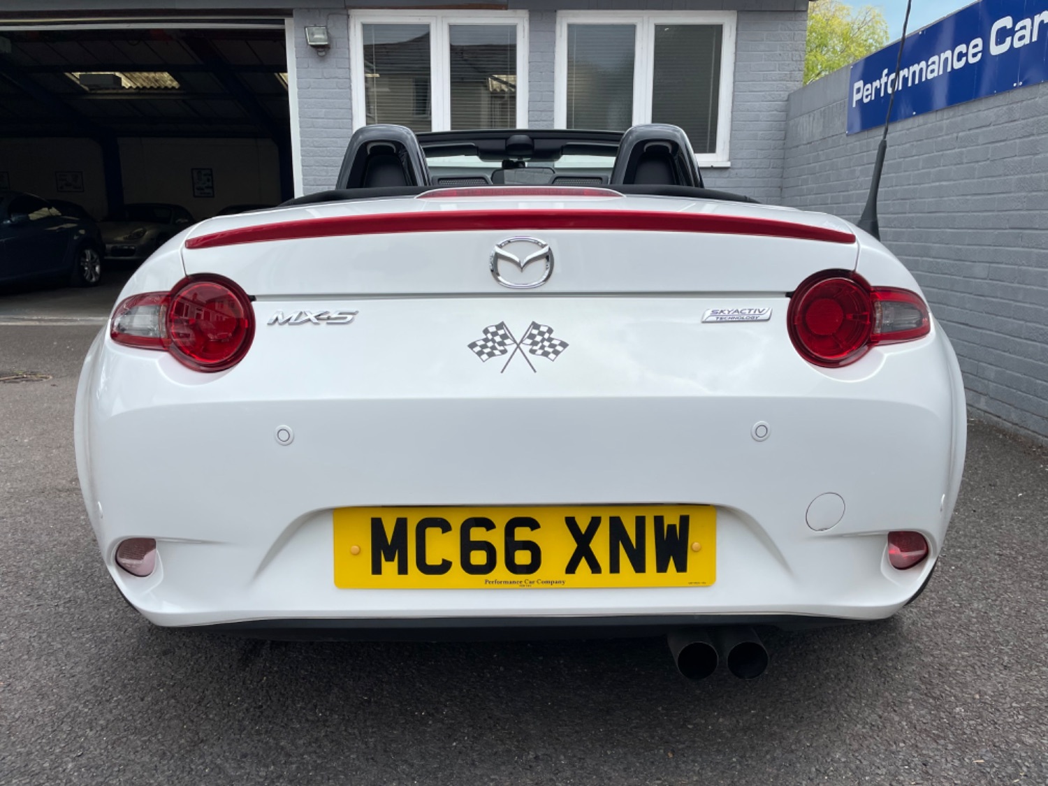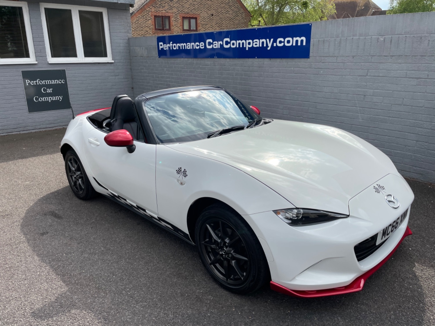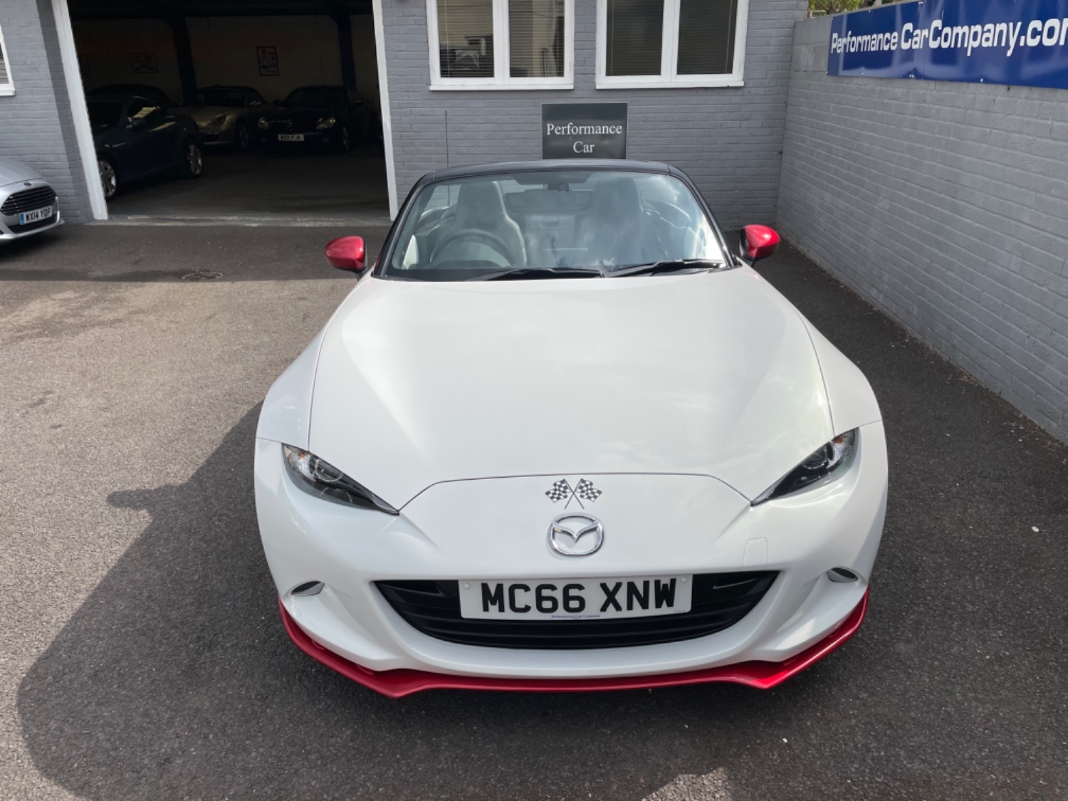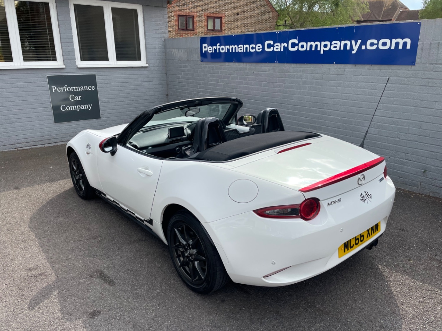 2017 / 66 Mazda MX-5 Icon Limited Edition 1 of 600 made, Finished in Crystal White Pearlescent with door mirrors, front and rear spoiler finished in Soul Red Metallic + Chequered Flag Decals, Having covered Only 19000 miles and with a Full Service History, 6 Speed Manual, Full Black Leather Seats, Heated Seats, 7 inch Satellite Navigation Screen, Factory Bluetooth, LED Headlights, Multi Function Steering Wheel, Cruise Control, Push Button Start, Dusk Sensing Lights, Auto Wipers, Rear Parking Sensors, Air Conditioning, Electric Windows, Electric Mirrors, Remote Alarm and Central Locking, Unmarked Anthracite Alloys. Fantastic looking MX-5 in absolutely Superb Original Condition. UK Supplied with Full Book Pack and Spare Key.
