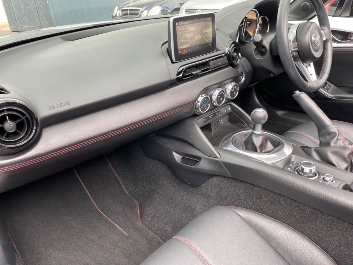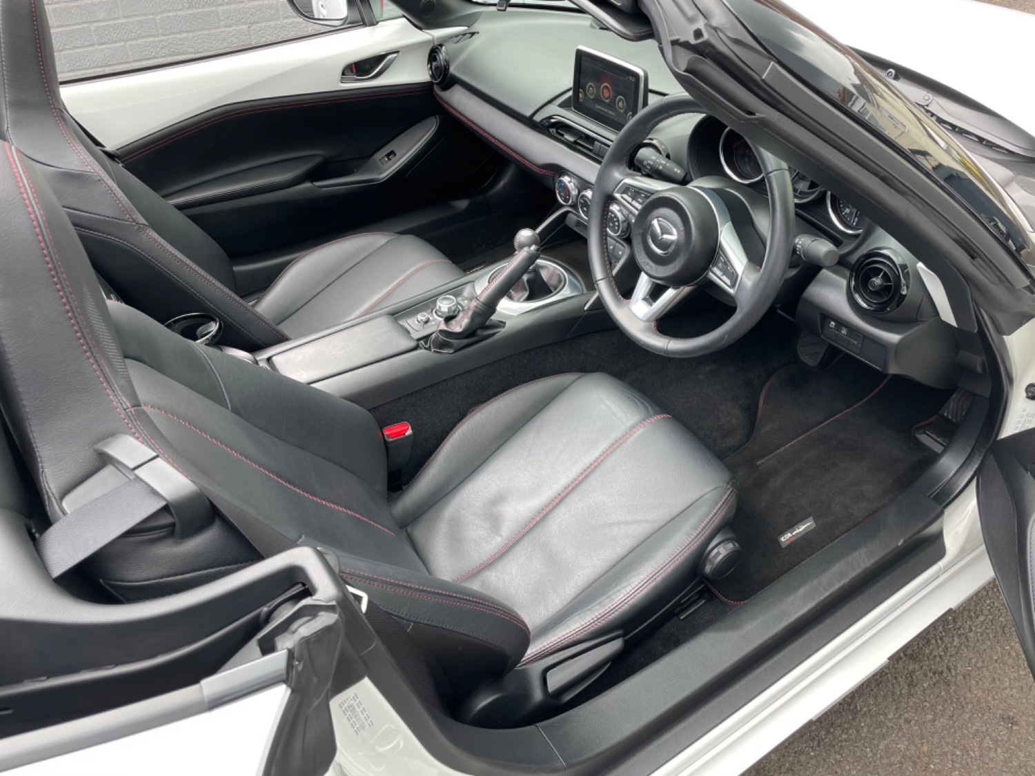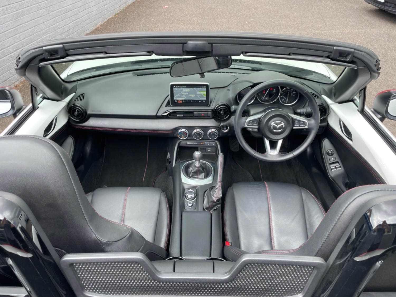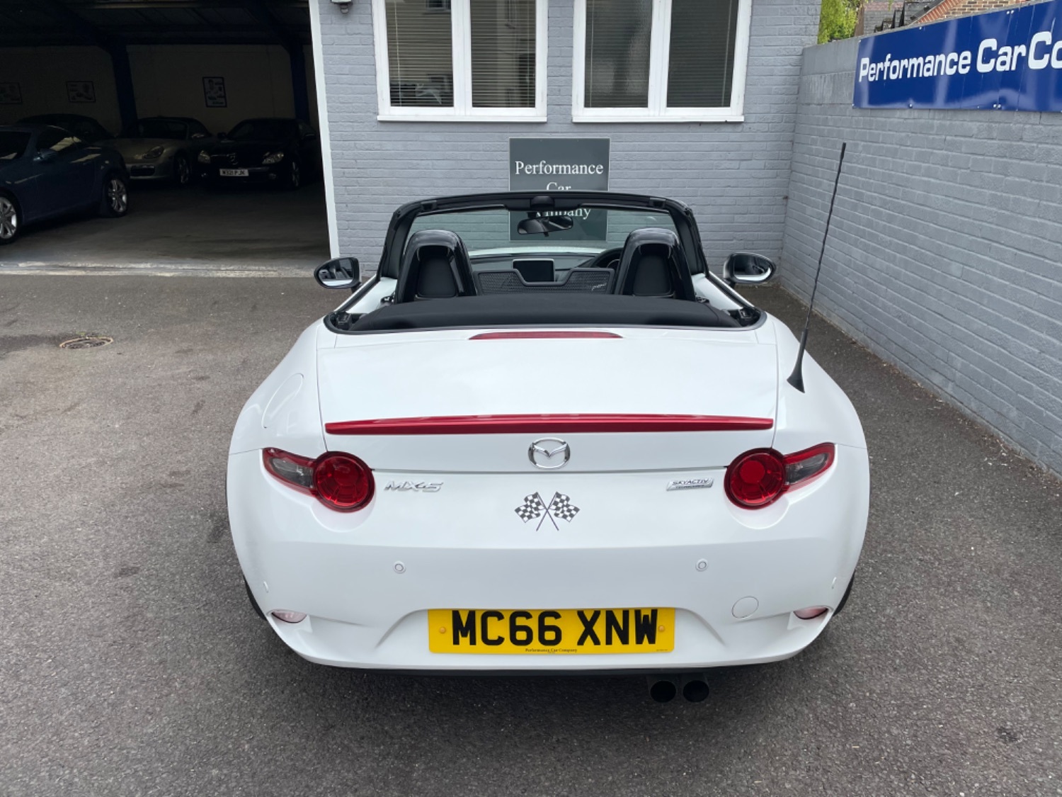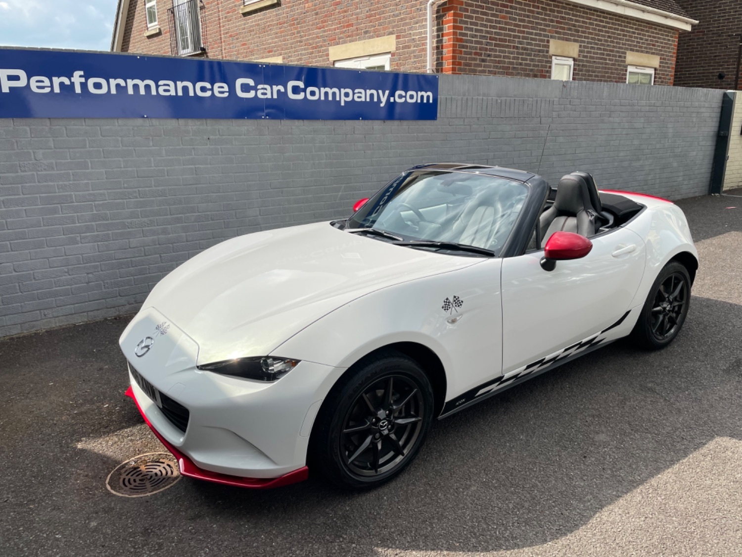 2017 / 66 Mazda MX-5 Icon Limited Edition 1 of 600 made, Finished in Crystal White Pearlescent with door mirrors, front and rear spoiler finished in Soul Red Metallic + Chequered Flag Decals, Having covered Only 19000 miles and with a Full Service History, 6 Speed Manual, Full Black Leather Seats, Heated Seats, 7 inch Satellite Navigation Screen, Factory Bluetooth, LED Headlights, Multi Function Steering Wheel, Cruise Control, Push Button Start, Dusk Sensing Lights, Auto Wipers, Rear Parking Sensors, Air Conditioning, Electric Windows, Electric Mirrors, Remote Alarm and Central Locking, Unmarked Anthracite Alloys. Fantastic looking MX-5 in absolutely Superb Original Condition. UK Supplied with Full Book Pack and Spare Key.