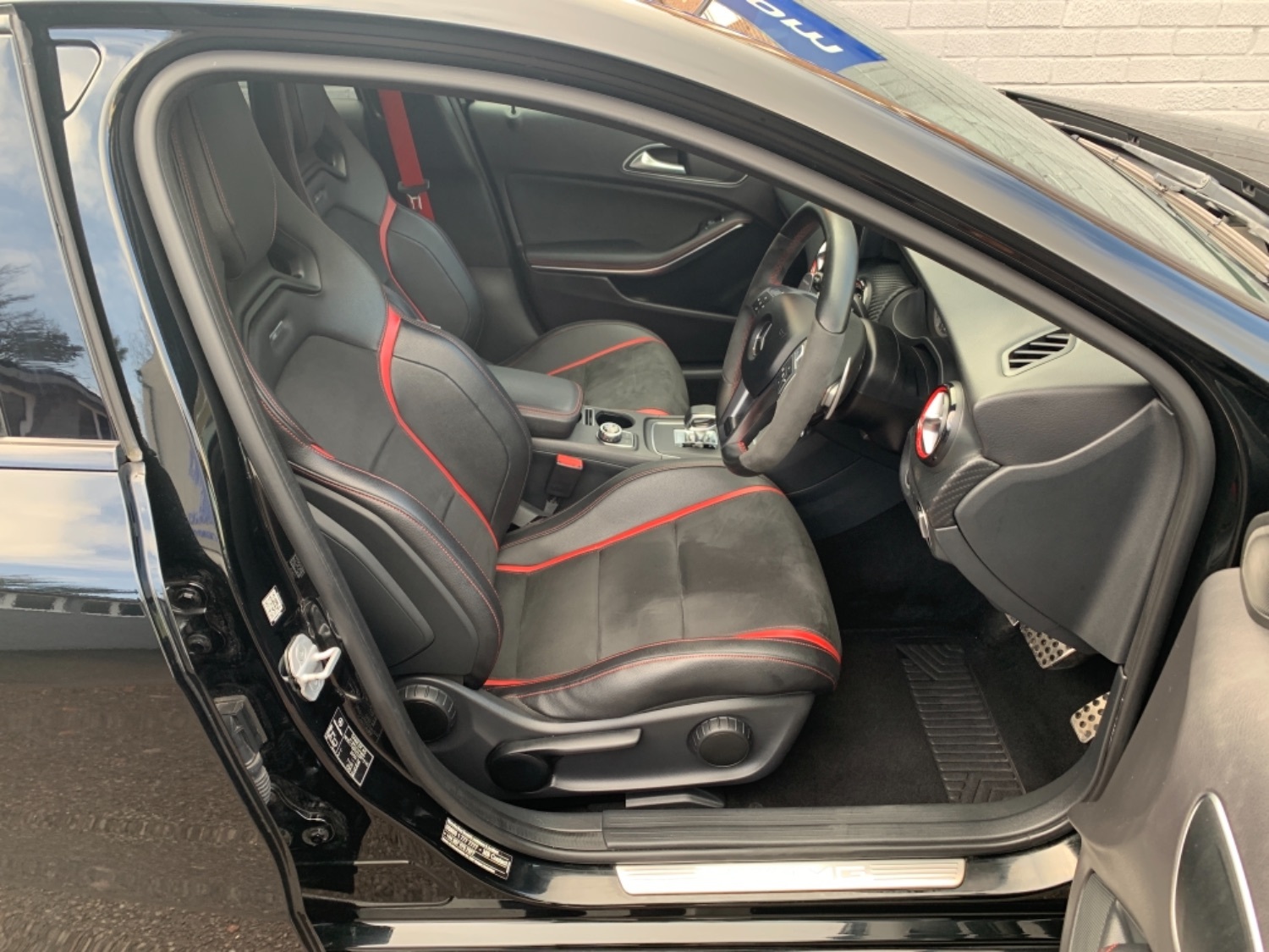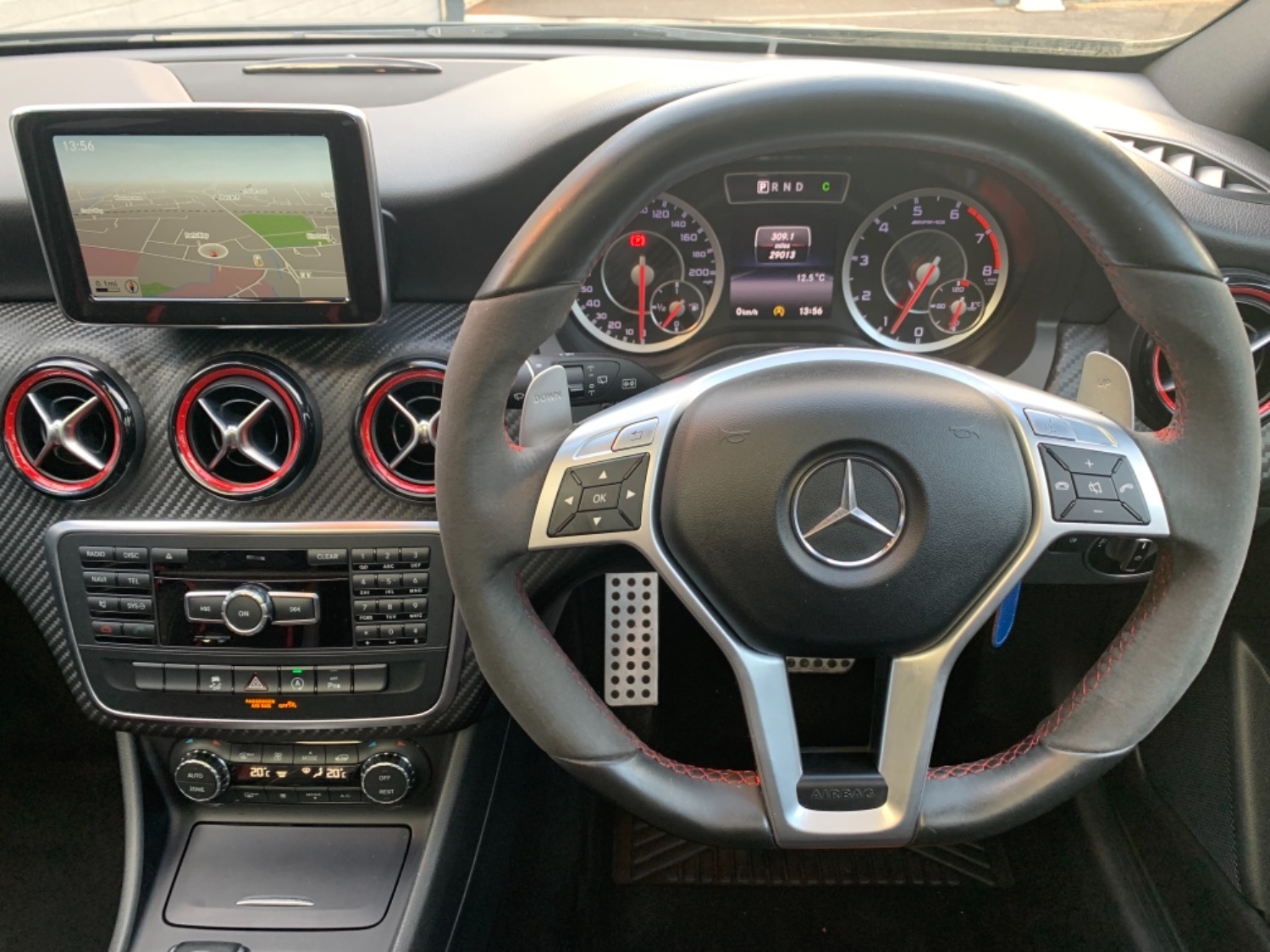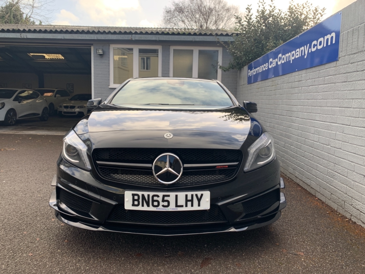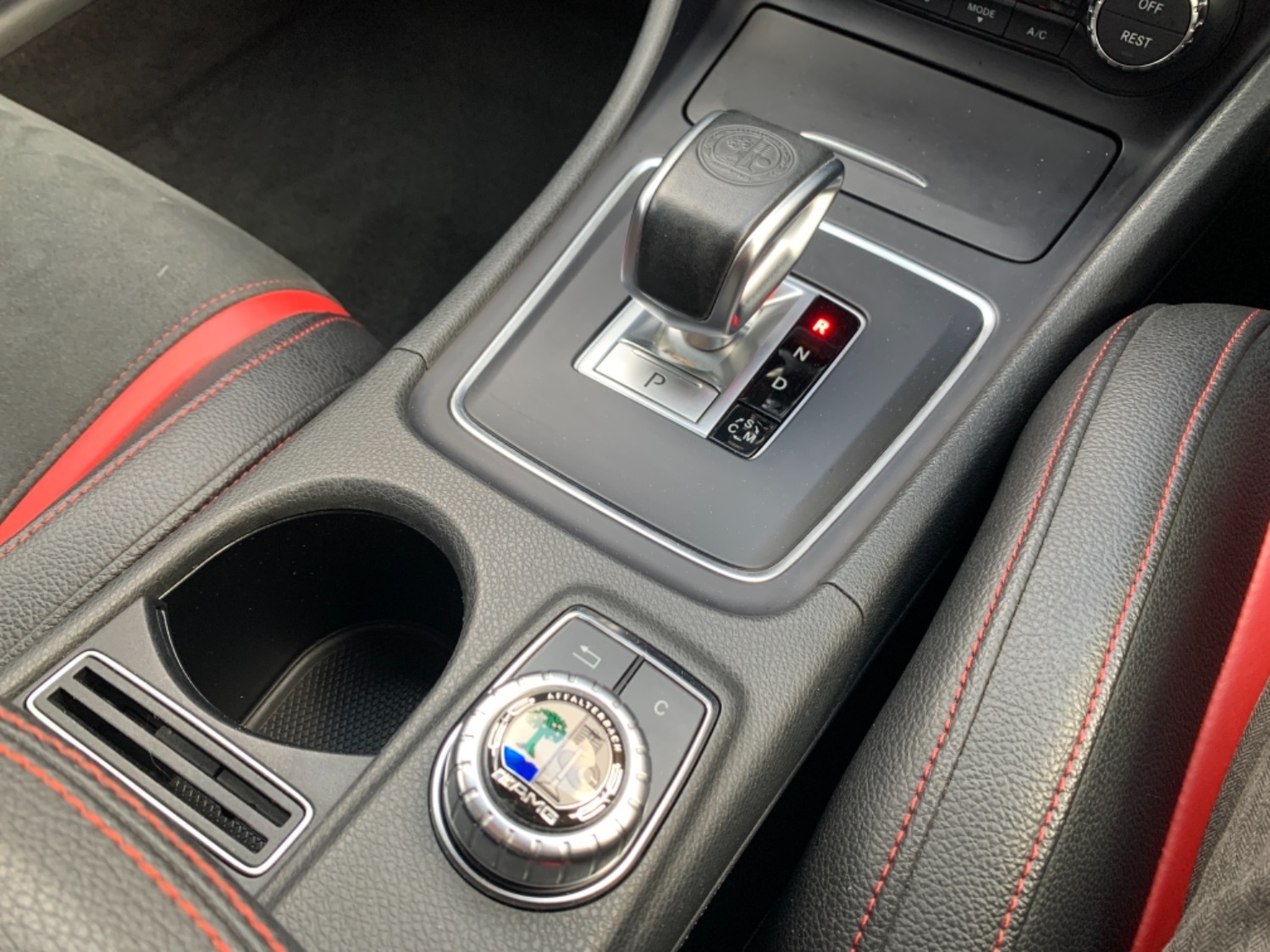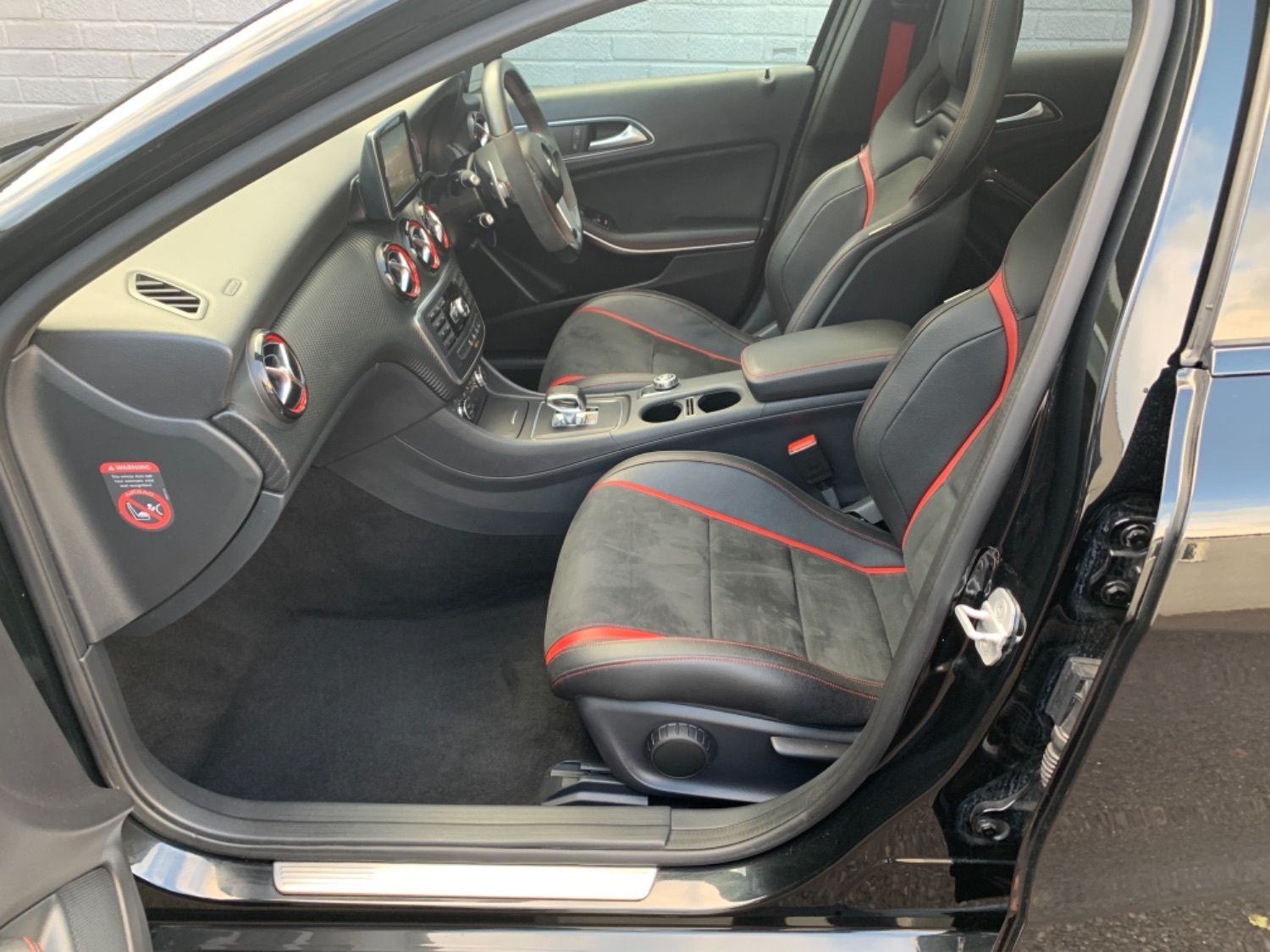 2015/65 Finished in Black with only 29,500 miles and a Full Mercedes and Specialist Service History with Services at 3977 miles, 6900 miles, 12800 miles, 19876 miles, 21090 miles and 25896 miles Plus just had Brand New Mercedes Gearbox fitted April 2021 at a cost of Five Thousand Pounds due to common issue of Crunching into Reverse when Cold. Full Aero Kit, AMG Designo Race Style Wing Back Front Half Leather/ Alcantara Sports Seats, Red Seat Belts, Electric Panoramic Glass Roof with Electric Blind, Carbon Fibre effect Dash, 19 Bi Colour AMG Alloys with Goodyear F1 Tyres all Round, Command Satellite Navigation, Factory Bluetooth, AMG Performance Leather / Alcantara Multi Function Flat bottom Steering Wheel, Cruise Control, Auto Lights, Xenons, Red brake Calipers, AMG illuminated Stainless Door sills, AMG Puddle Lights, AMG Night Package ( Exterior ), illumination Package, Front and Rear Parking Sensors, Sun Protection Glass, Climate Air Conditioning, Remote Alarm And Central Locking, Electric Mirrors. Absolutely Superb Condition, Stunning Looking A45 AMG with High Specification in a Great Colour Combination. UK Supplied with Full Book Pack and Spare key.