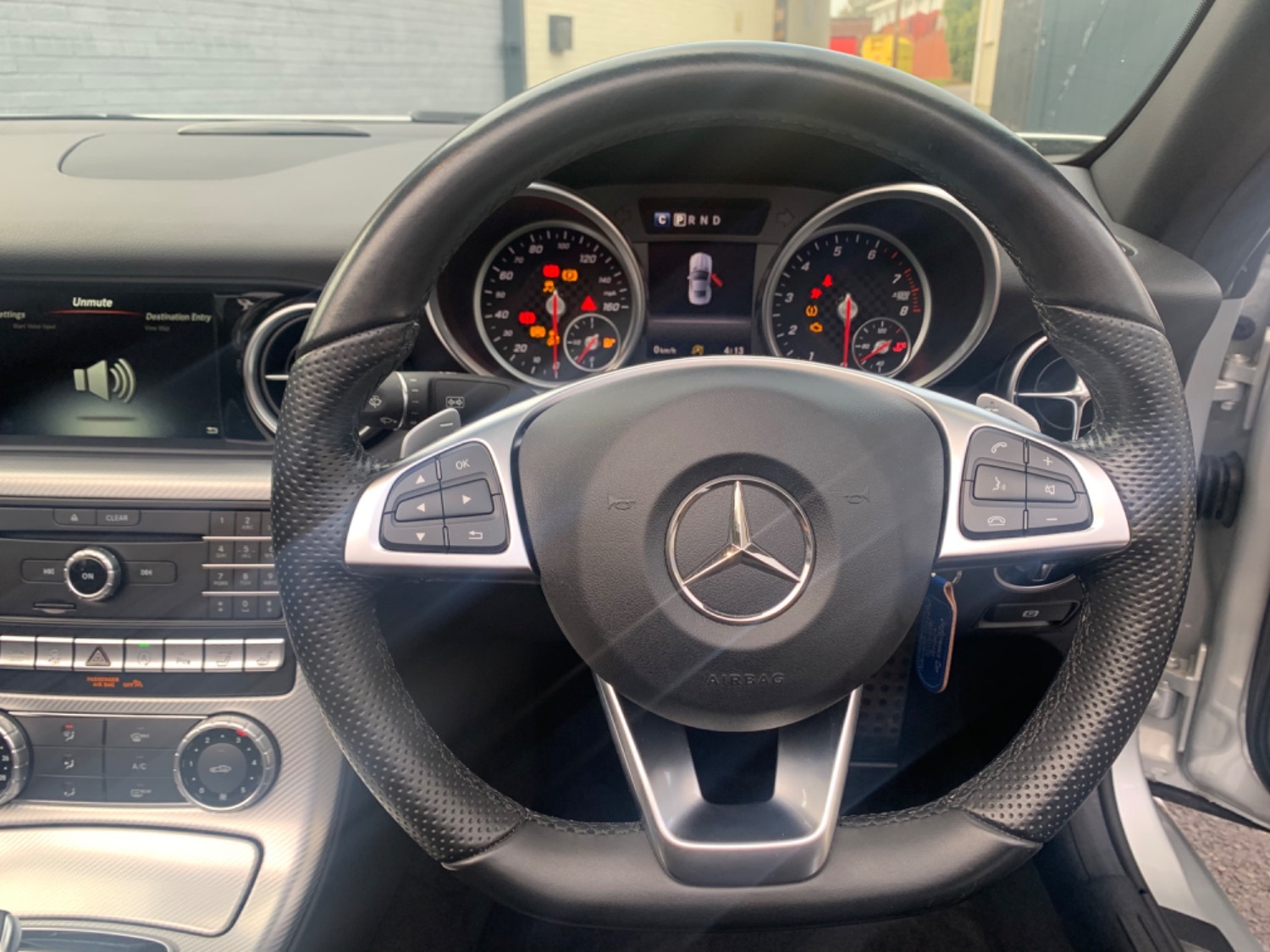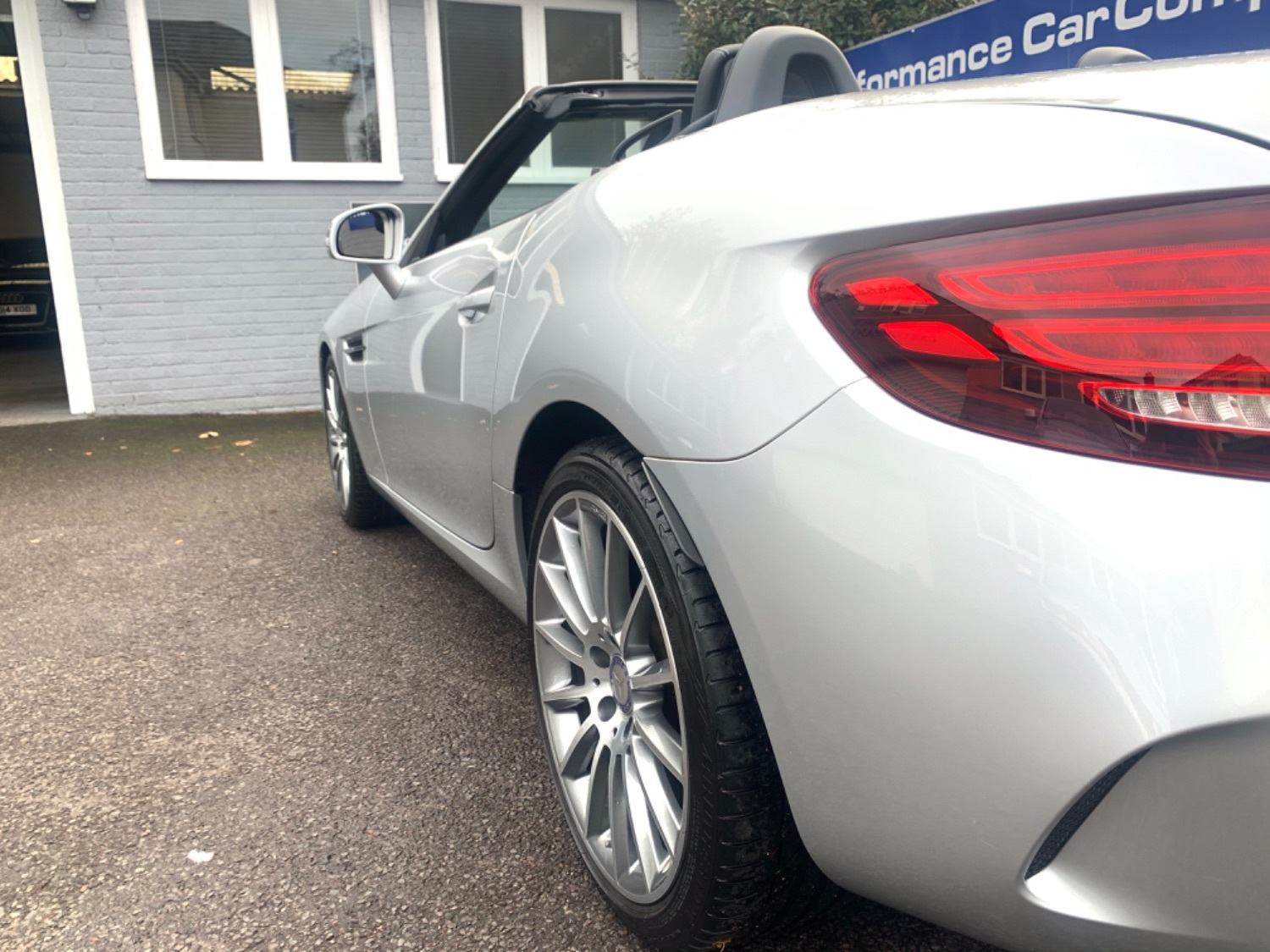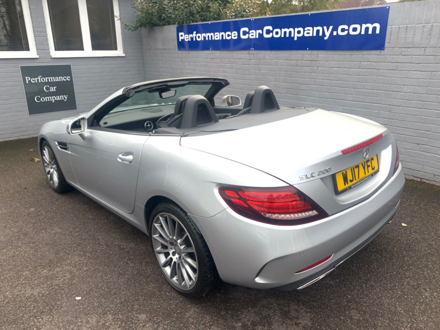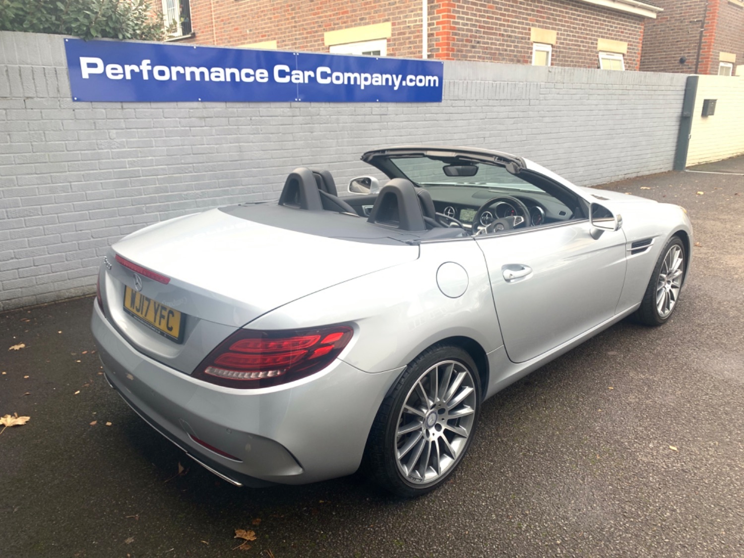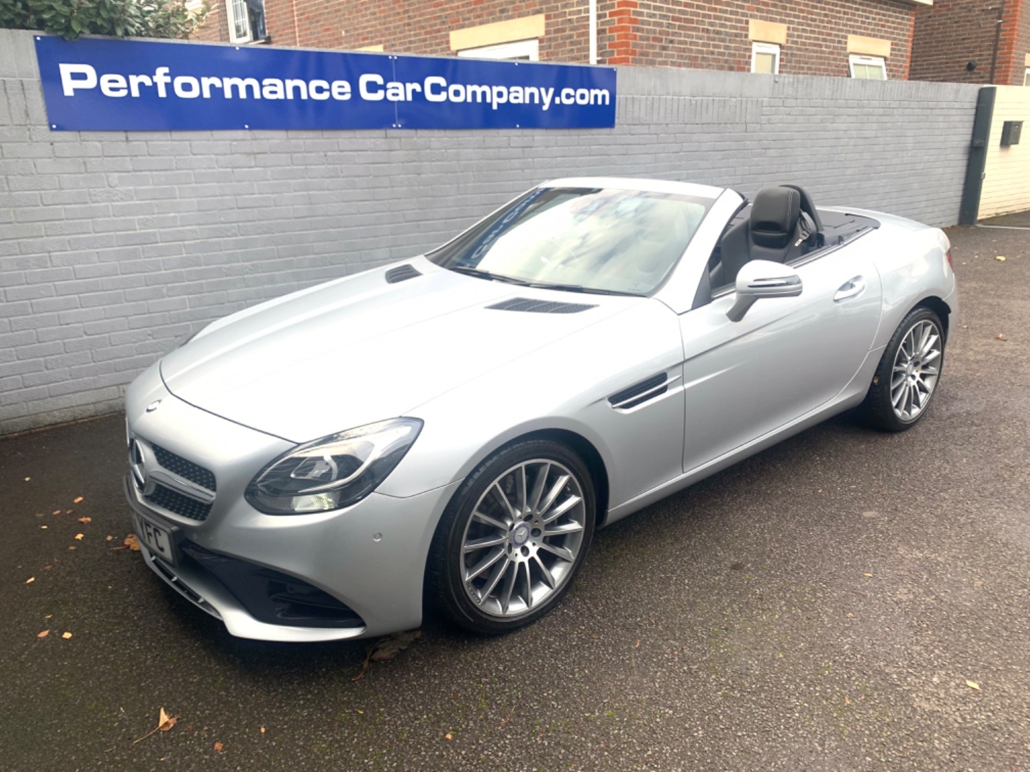 Finished in Metallic Silver with only 9959 miles by One Private Owner and a Full Mercedes Main History with Services at 4118 miles, 7280 miles and 9086 miles. Black Leather With Silver Stitching Sports Seats, Heated Seats, Airscarf, Satellite Navigation, Panoramic Roof, Mercedes Bluetooth, DAB, Air Conditioning, Multi Function Steering Wheel with Paddle gear Change, Dynamic Select, Cruise Control, Auto Lights. Auto Wipers, 18 AMG Polished Alloys with Bridgestone Potenza tyres all round, Front and Rear Parking Sensors, Power folding Roof, Remote Alarm and Central Locking. High Specification Very Low mileage 1 owner 2017 17 SLC200 AMG LINE in Absolutely Fantastic Original Condition. UK Supplied with Full Book Pack, Service Invoices and Spare Key.
