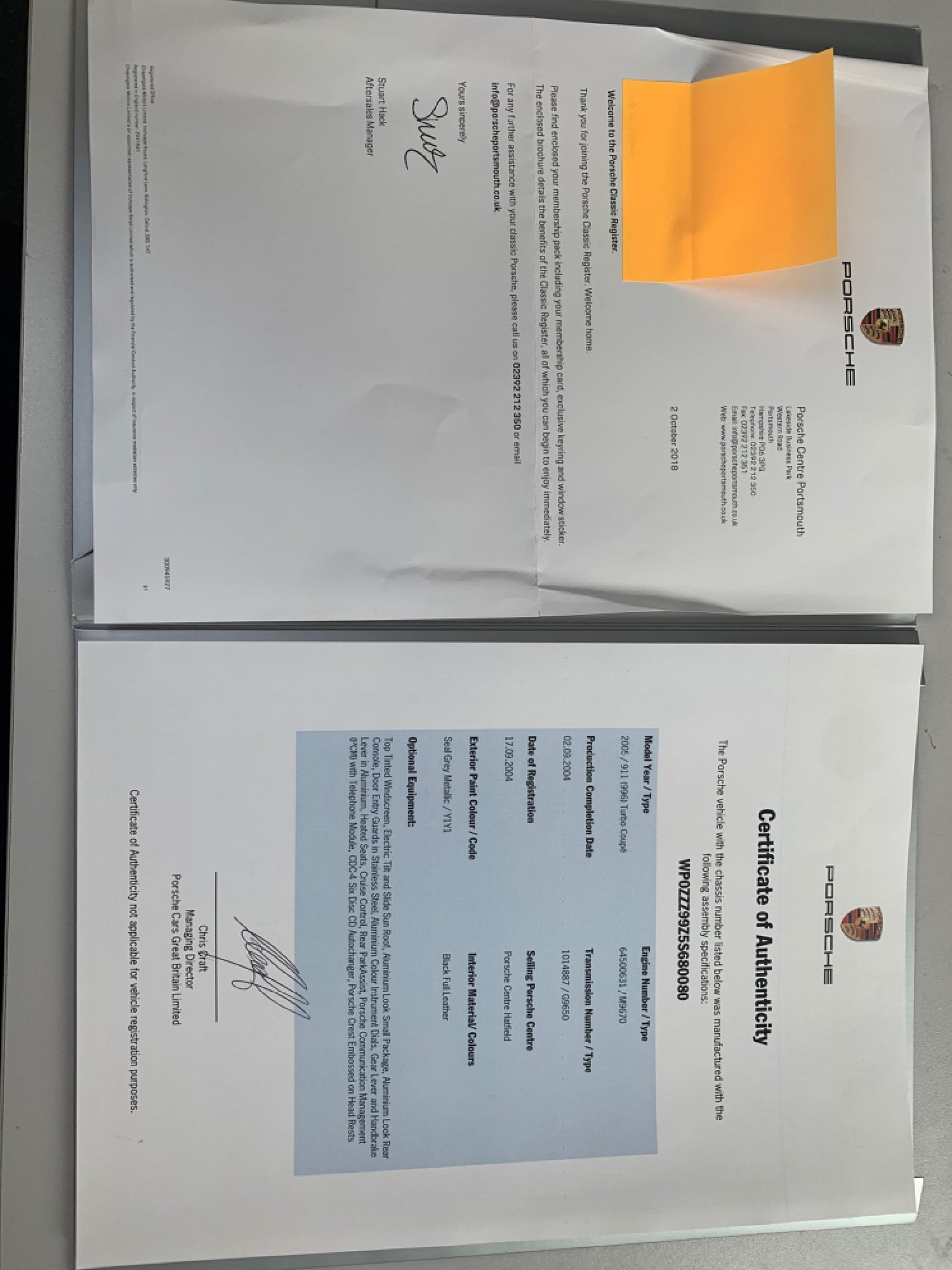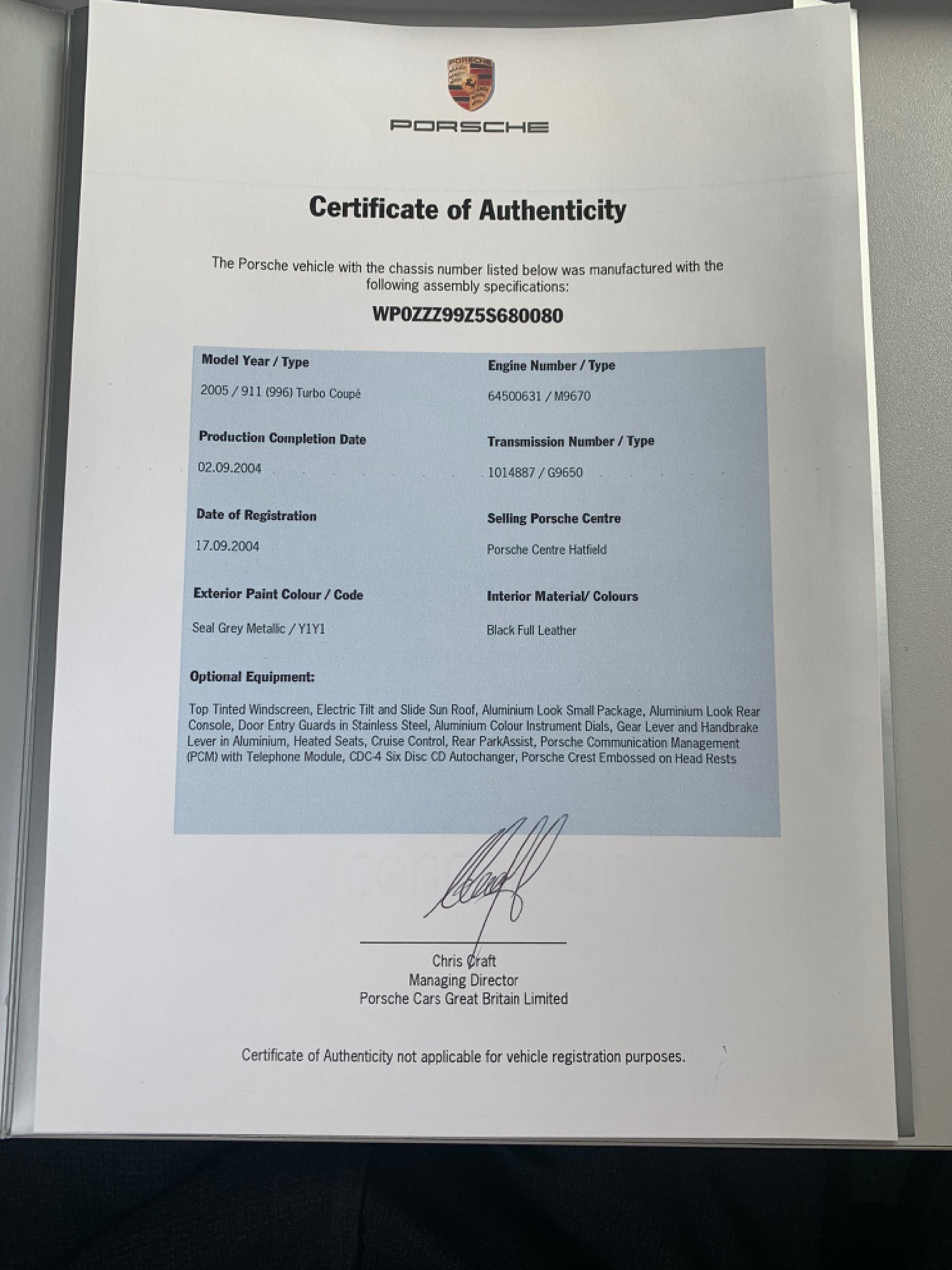 Porsche 996 Turbo Coupe Manual Finished in Metallic Seal Grey and Only 49400 miles With a Full Porsche Main Dealer + Porsche Specialist Service History with Services at 12907 miles Porsche Centre Colchester, 24135 miles Porsche Centre Silverstone, 28821 miles Porsche Centre Silverstone, 35264 miles RS Porsche, 38376 miles Portiacraft, 45413 miles Cridfords..46991 miles Porsche Centre Portsmouth including 111 Point check and 2 Years Porsche Warranty taken out with a Total Cost of 4066 Pounds and then 48998 miles Porsche Centre Portsmouth. This 911 Turbo has done 402 miles since its last service and we will carry out another Oil service on the car before it leaves us so that it is ready to Drive and Enjoy. 6 Speed Manual, Full Black Leather Seats with Embossed Porsche Crest headrests, Electric Memory Drivers Seat, Heated Seats, Upgraded Touch Screen Satellite Navigation + Bluetooth, PSM, Carbon and Leather Steering Wheel, Xenons, Climate Air Conditioning which is lovely and Cold, Computer,CD + BOSE, Cruise Control, Rear Wiper, Rear Parking Sensors, Electric Sunroof, Stainless Steel Door entry Guards, Aluminium Colour Instrument Dials, Gear Lever and Handbrake in Aluminium, Aluminium Look Small Package, Aluminium Look Rear Console,18 Unmarked Alloys with Turbo Wheel Centres and Michelin Pilot Sport N Rated Tyres All Round, Electric windows, Electric Mirrors, Remote Alarm and Central Locking. Porsche Classic Certificate of Authenticity. This 996 Turbo is in Absolutely Fantastic Condition and Drives Superbly. Everything works exactly as it should plus its in a Great Colour Combination. This car has had a a few Enthusiast and Caring Owners in its 16 years and what 911 hasn’t but then it is priced at an amazing price for the next Enthuiast owner to enjoy. This must be the Best Value 2004/54 996 Turbo Manual Coupe with under 50000 miles available. You will not be disappointed when you view and drive this 911.